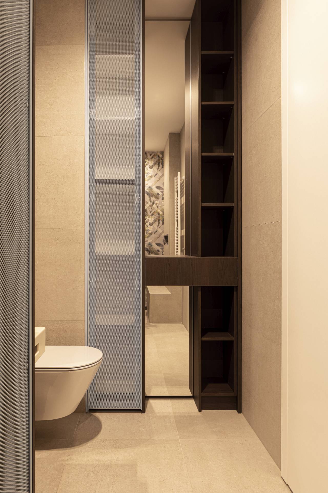 S obzirom na manju površinu stana i tehnička ograničenja konstrukcije, alternativna rešenja praktično nisu bila izvodljiva. Upravo zato detalj i materijal postaju ključni alati oblikovanja.