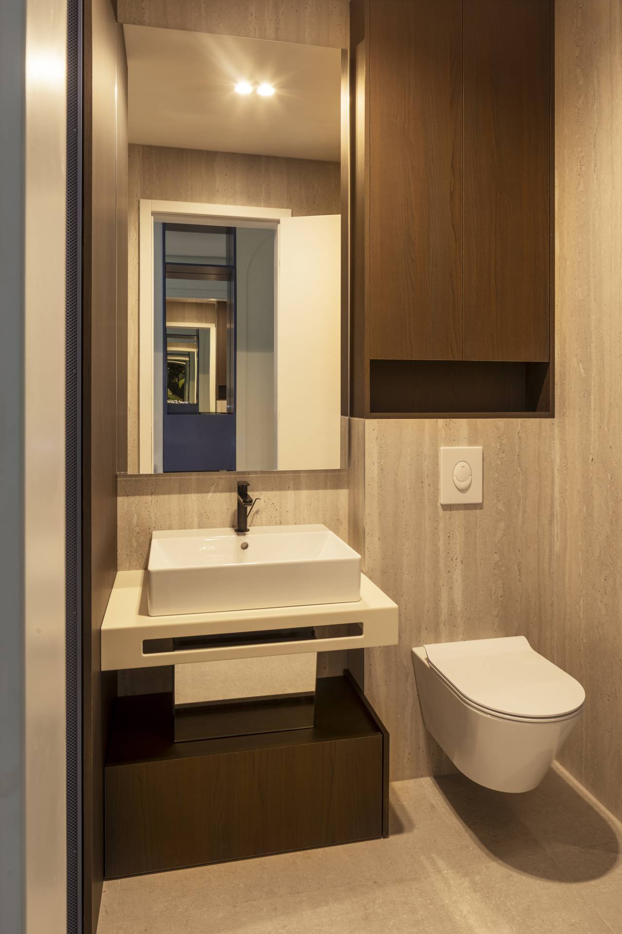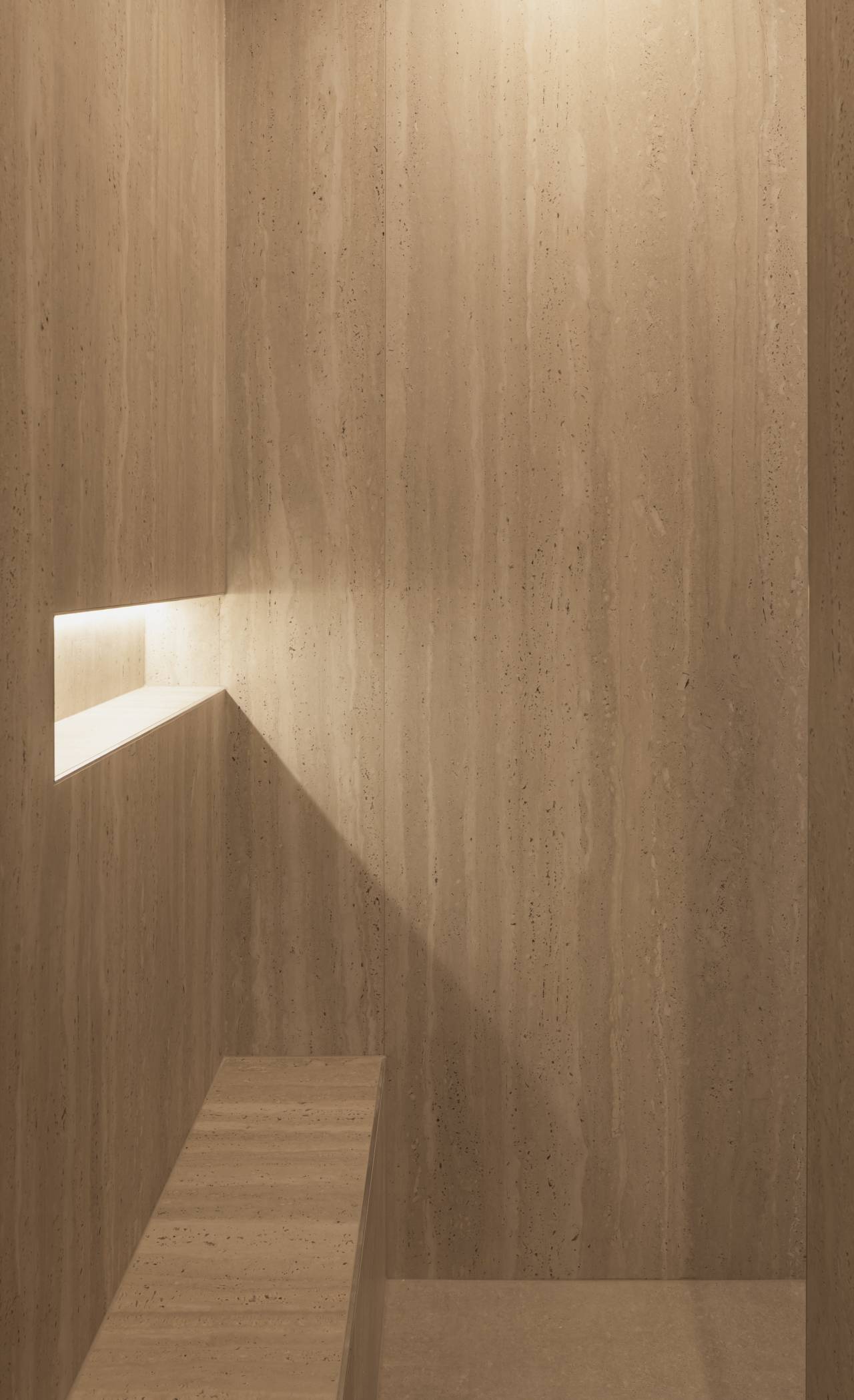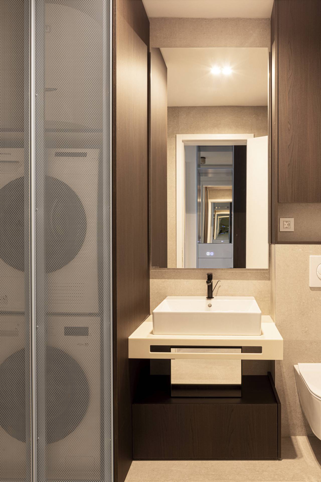 Zakrivljene obloge objedinjene su u precizno kontrolisanu formu, a u njih je integrisana LED rasveta koja dodatno naglašava liniju i daje dubinu prostoru.
