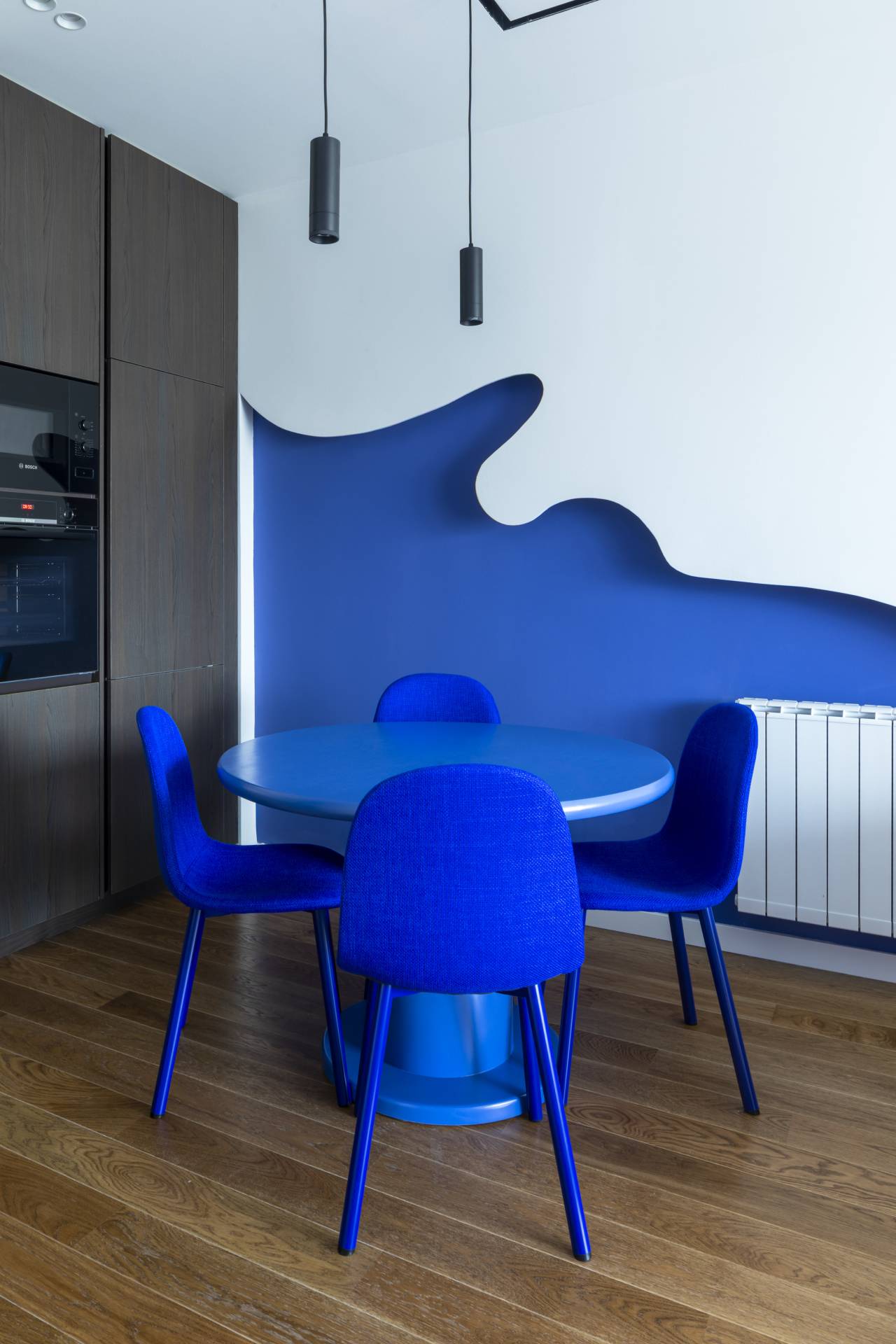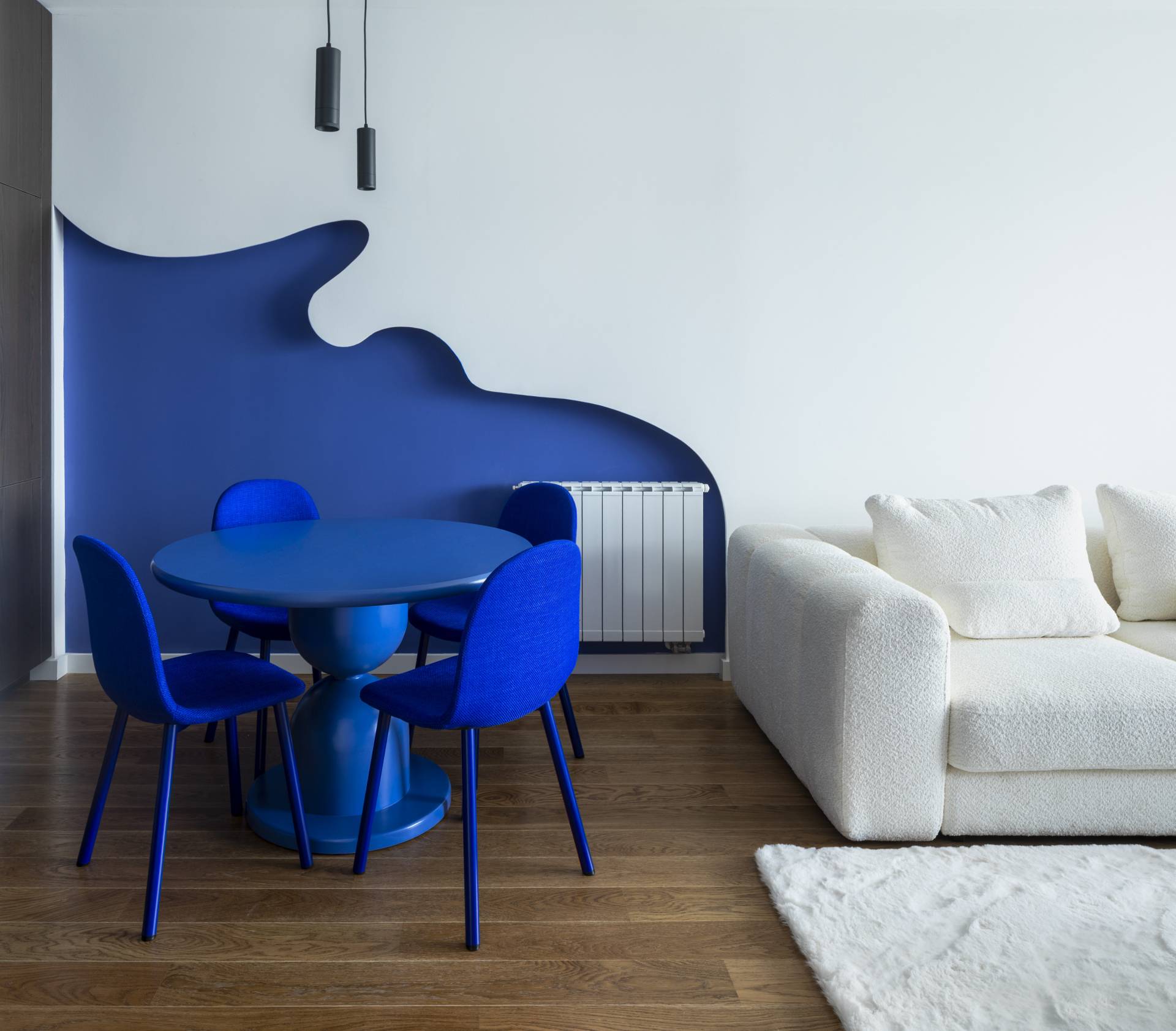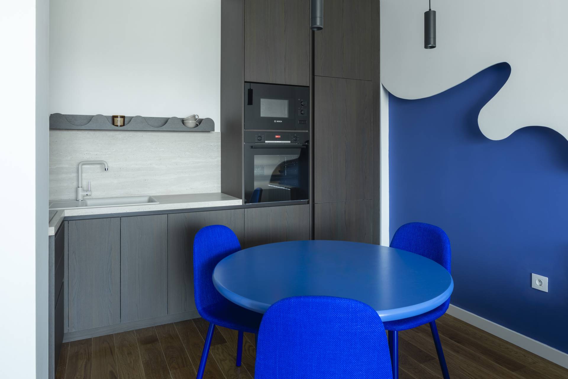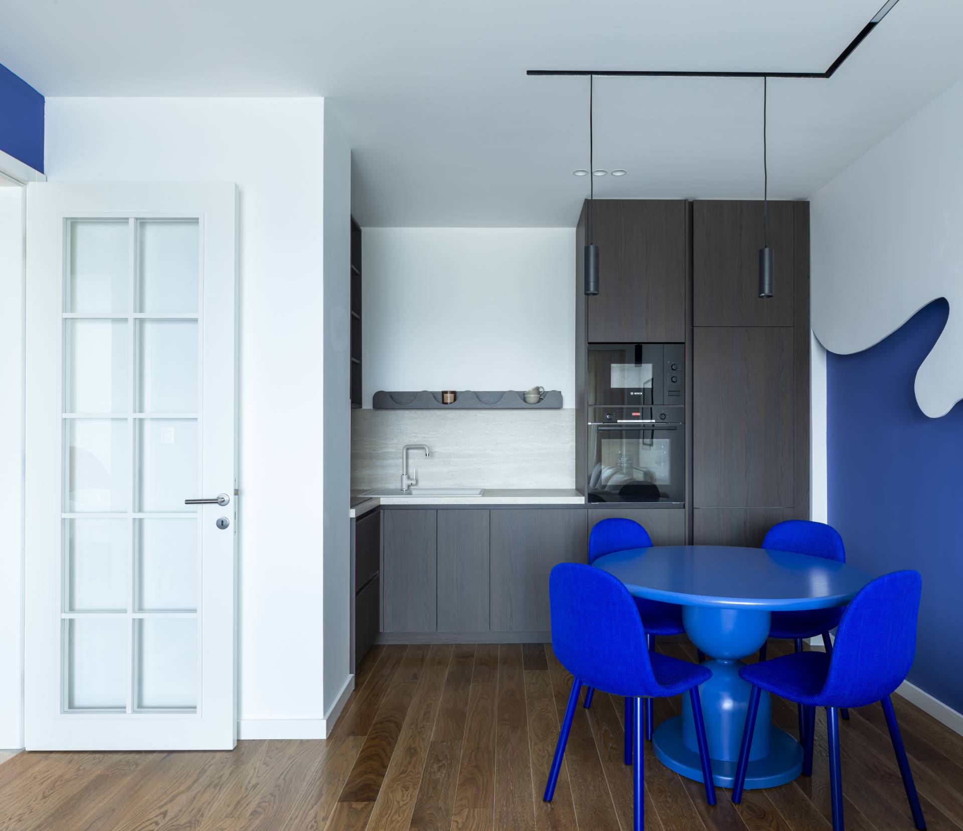 Centralni motiv dnevne zone je organski oblikovana zidna površina, dok trpezarijski sto i stolice u monohromatskoj plavoj boji dodatno učvršćuju vizuelni identitet prostora.