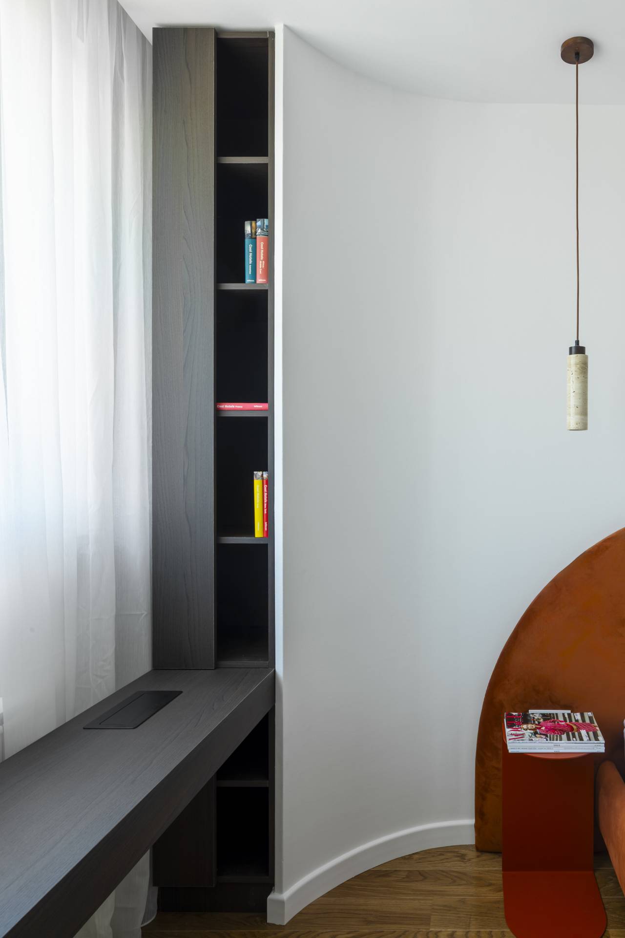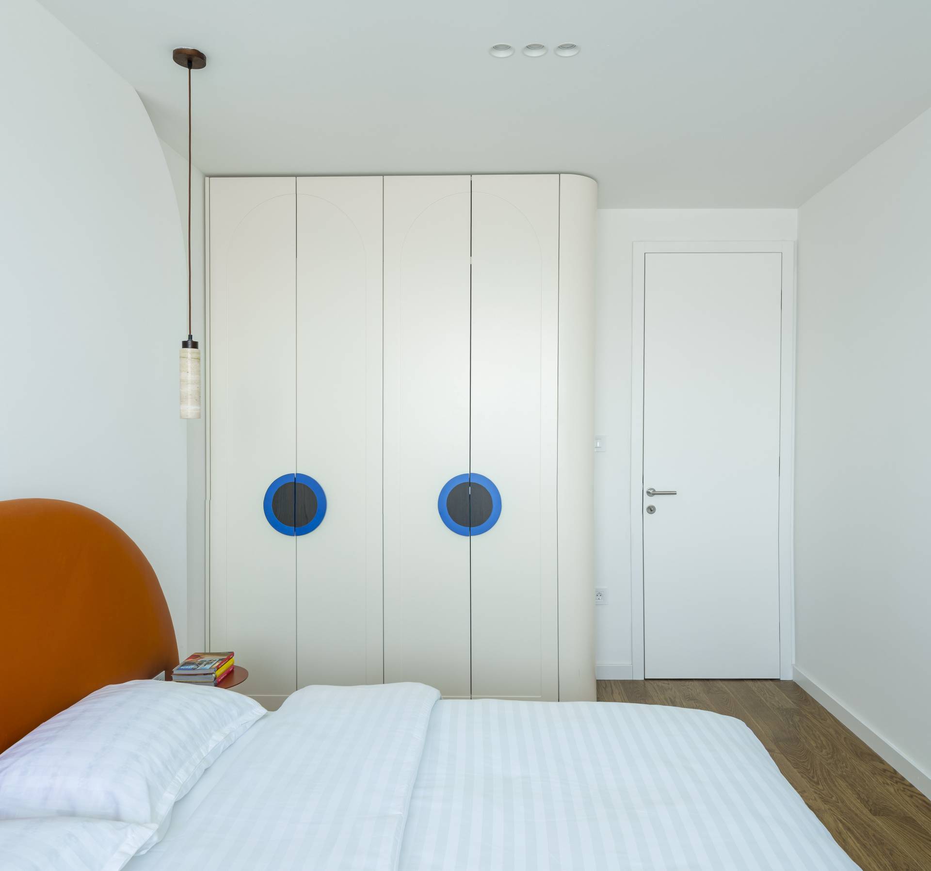 Nameštaj u spavaćoj sobi prati zakrivljenu logiku enterijera, odstupajući od stroge ortogonalnosti i dodatno naglašavajući organski karakter projekta.