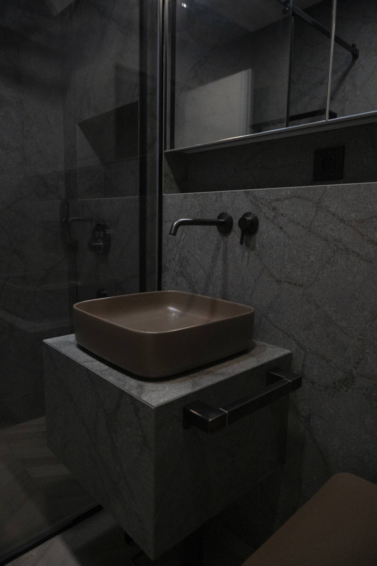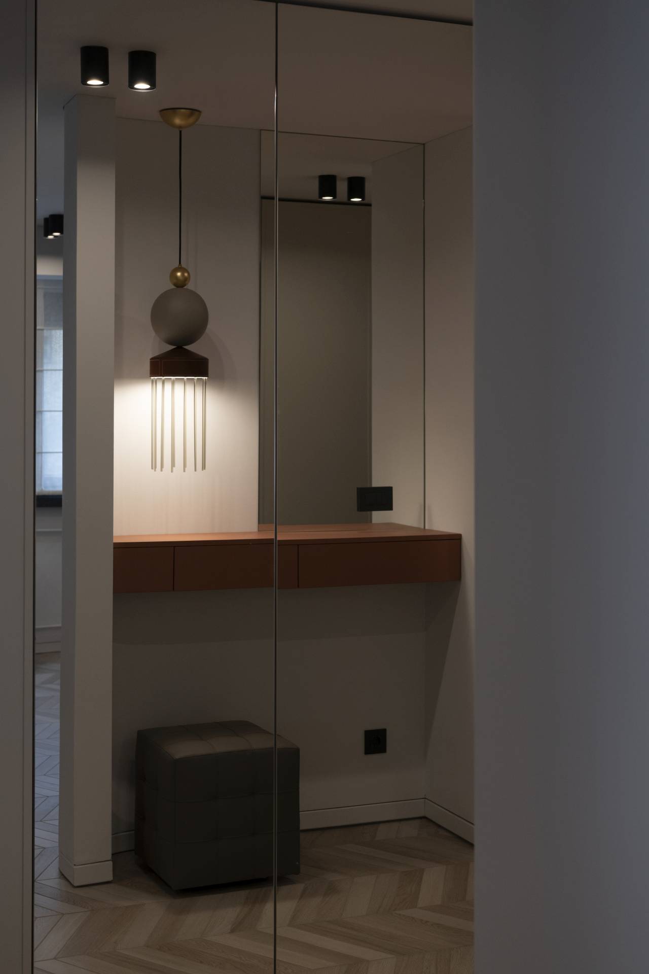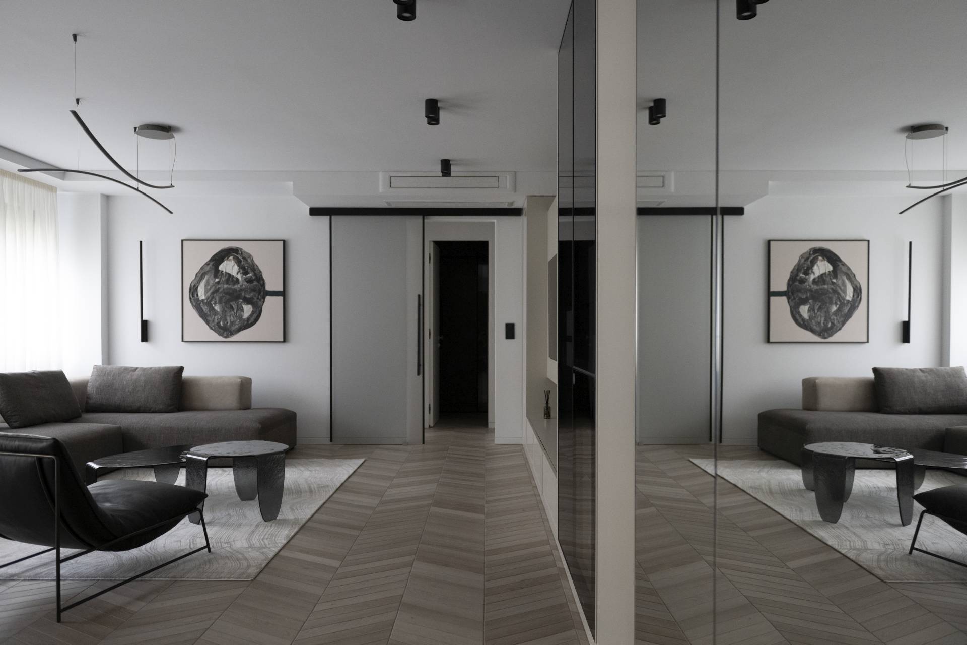 Ubeogradskom soliteru iz šezdesetih godina, u snažnom modernističkom okruženju, ovaj stan projektovan je kao svesno introvertan prostor. Enterijer ne reaguje bukom na buku grada, već gradi mir kao osnovnu arhitektonsku vrednost.