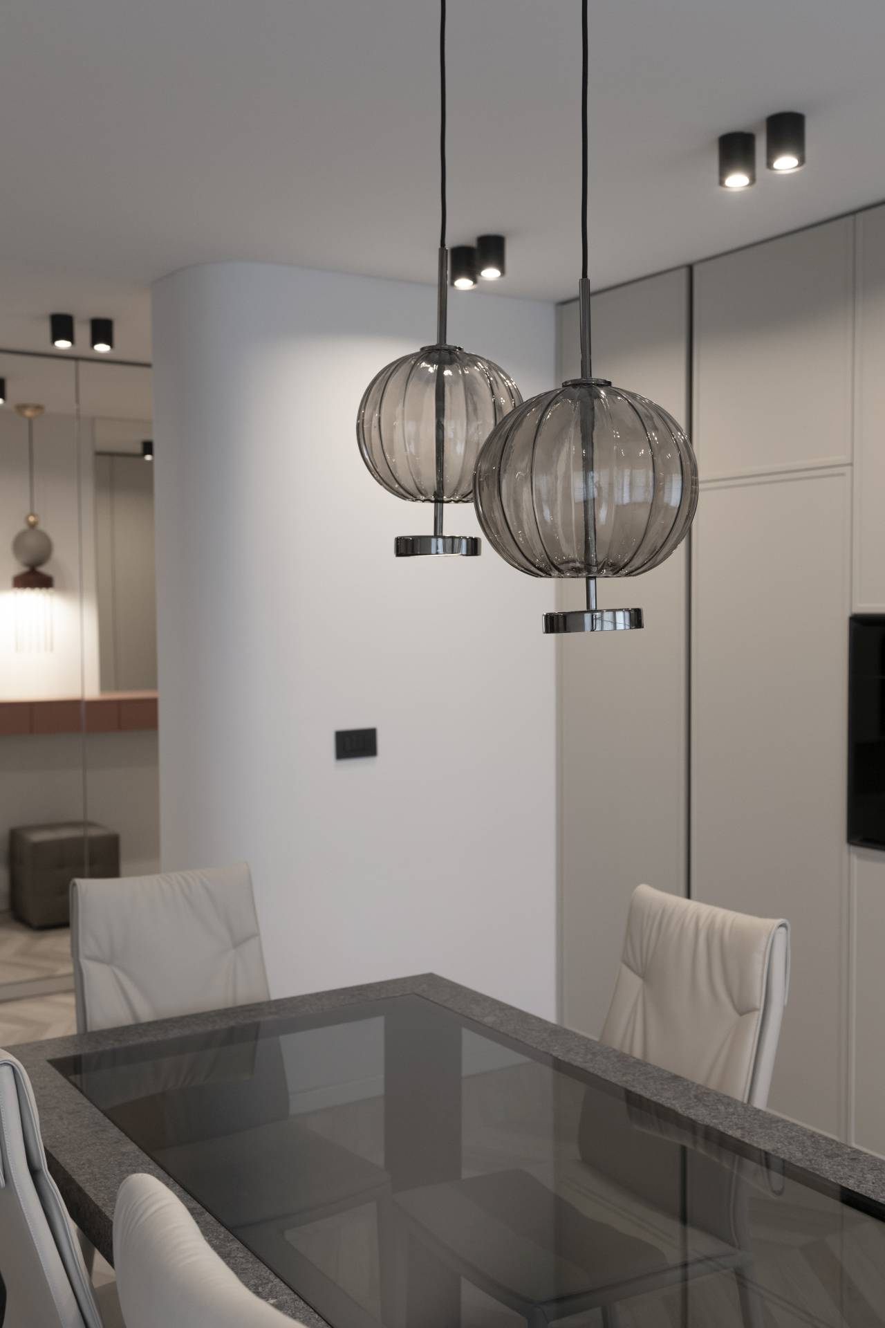 Trpezarijski sto od stakla dizajniran je posebno za ovaj stan, dok su stolice, fotelja i manji komadi birani među italijanskim proizvođačima.