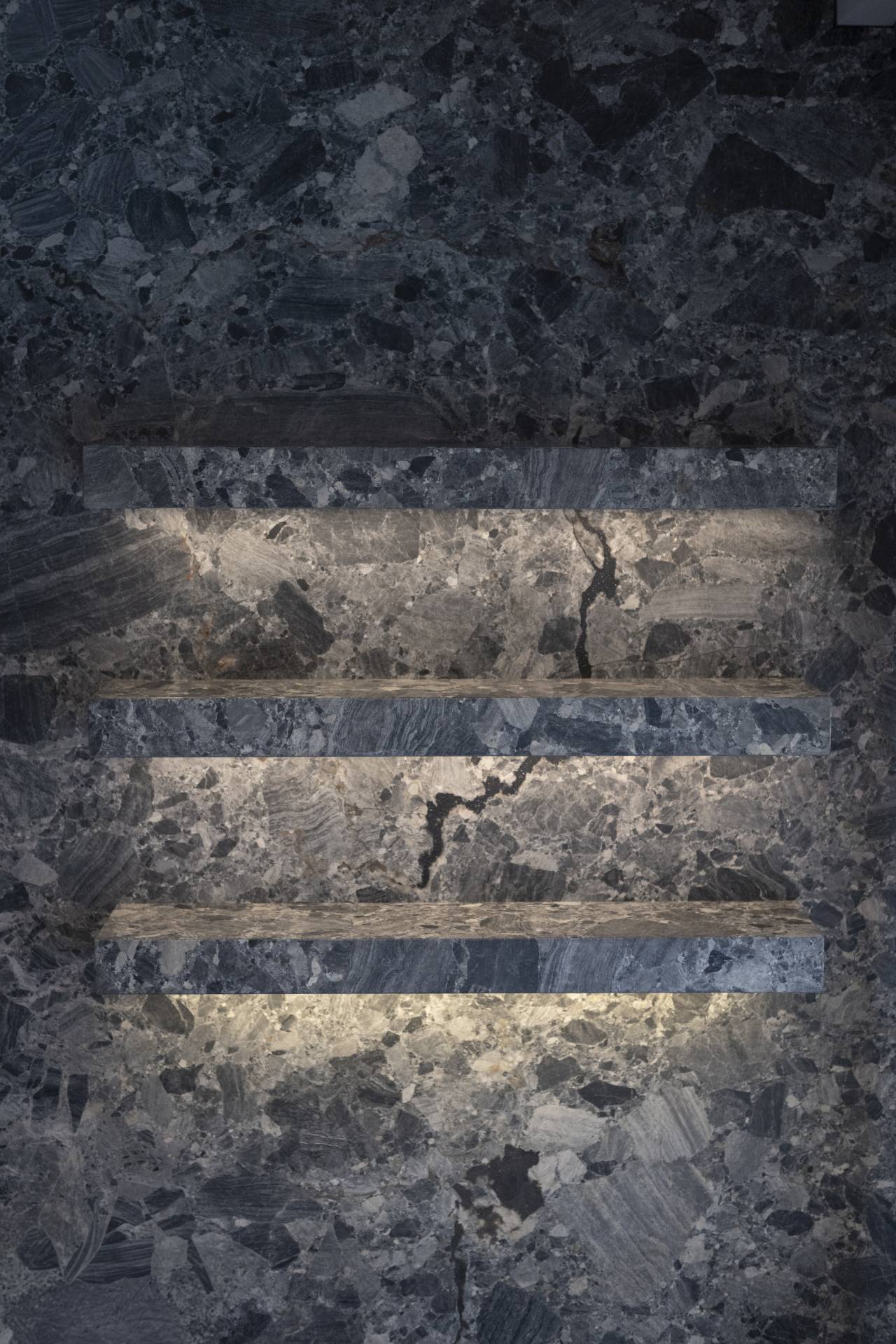 Hladni tonovi doprinose osećaju stabilnosti, dok su topli akcenti uvedeni da bi se postigla ravnoteža između strukture i atmosfere.