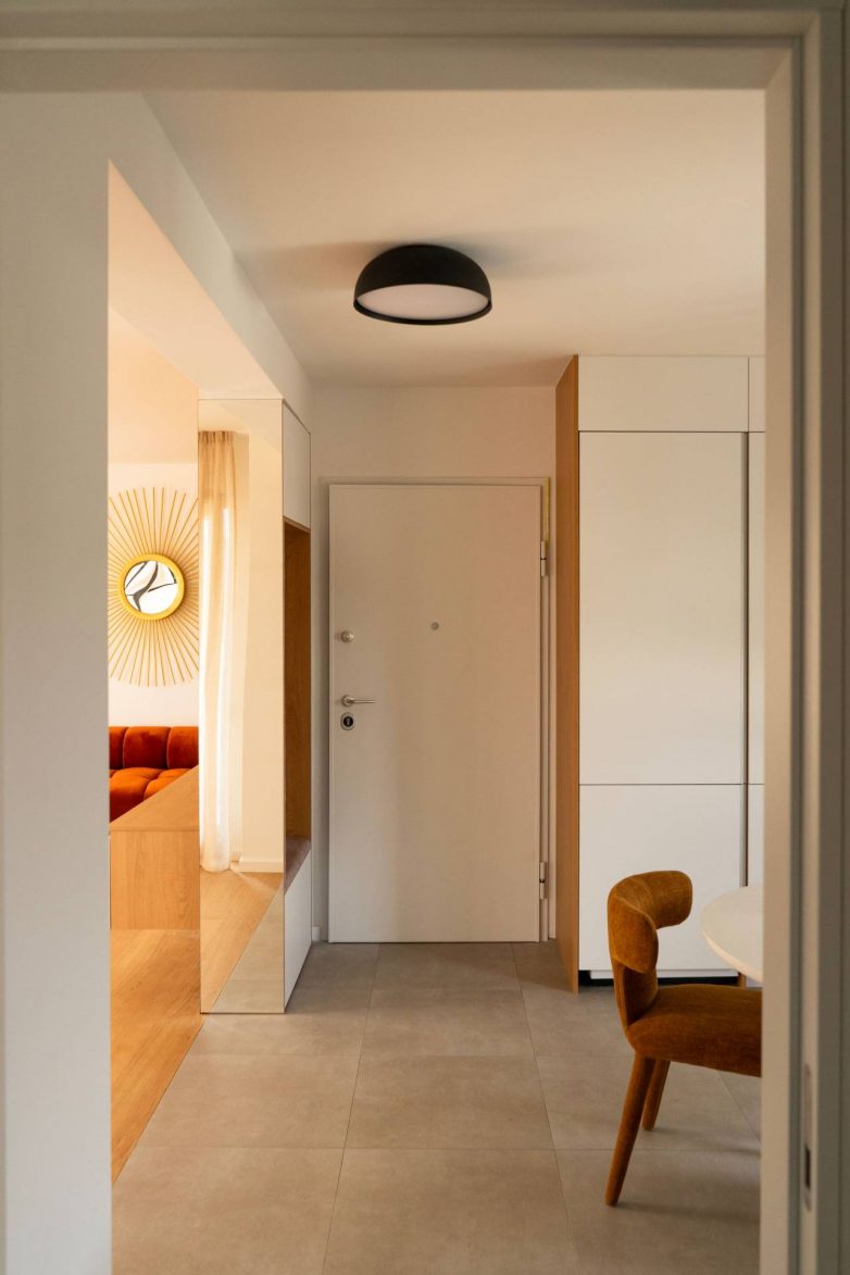 Ulazni deo stana, koji u startu nije bio jasno definisan, dobio je novu funkciju zahvaljujući niši sa ugrađenom klupom, prostorom za odlaganje obuće i garderobe.