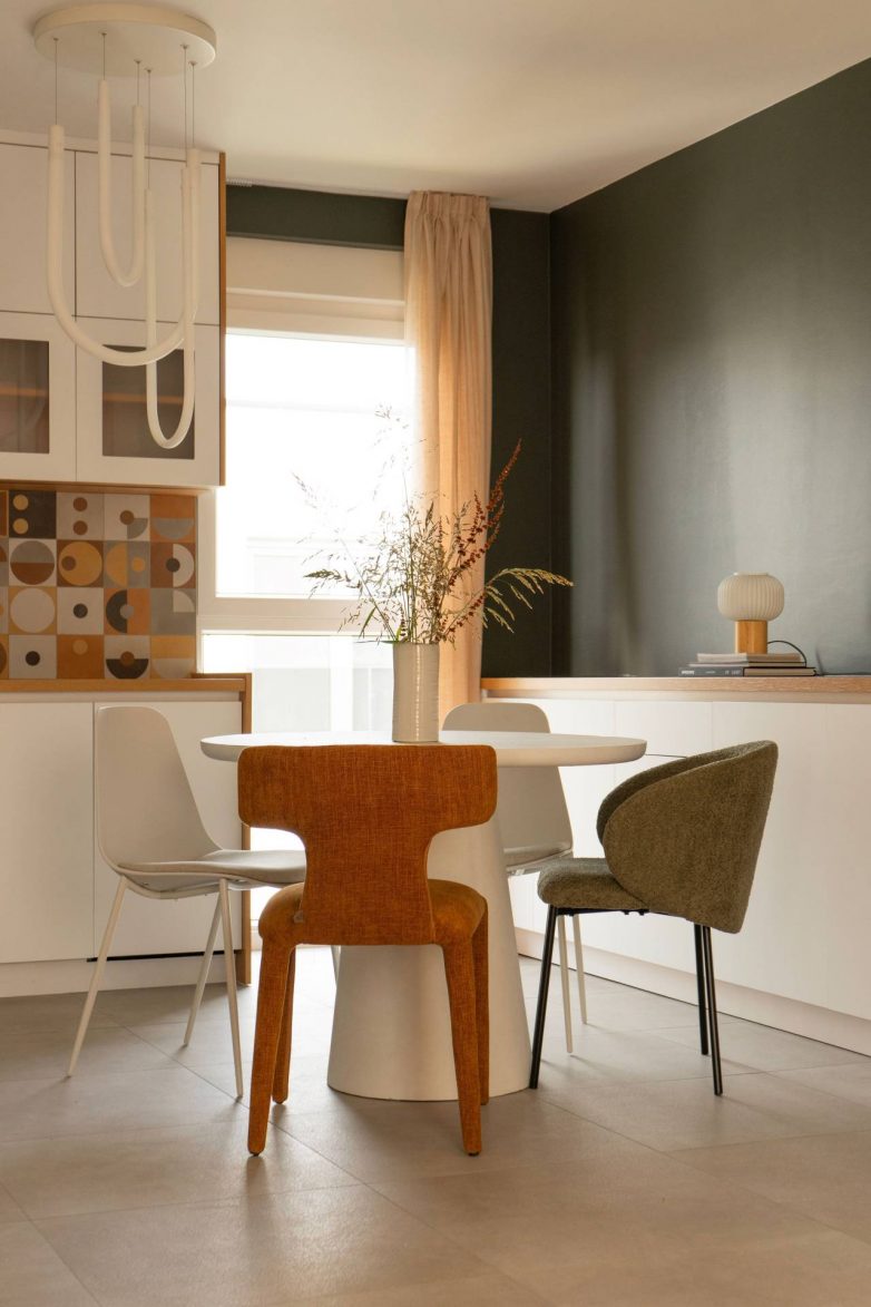 U tom kontekstu uvedene su zidne kuhinjske pločice sa diskretnim geometrijskim motivima, koje unose blagi retro prizvuk, dok su dominantne akcentne nijanse narandžaste i tamnozelene.