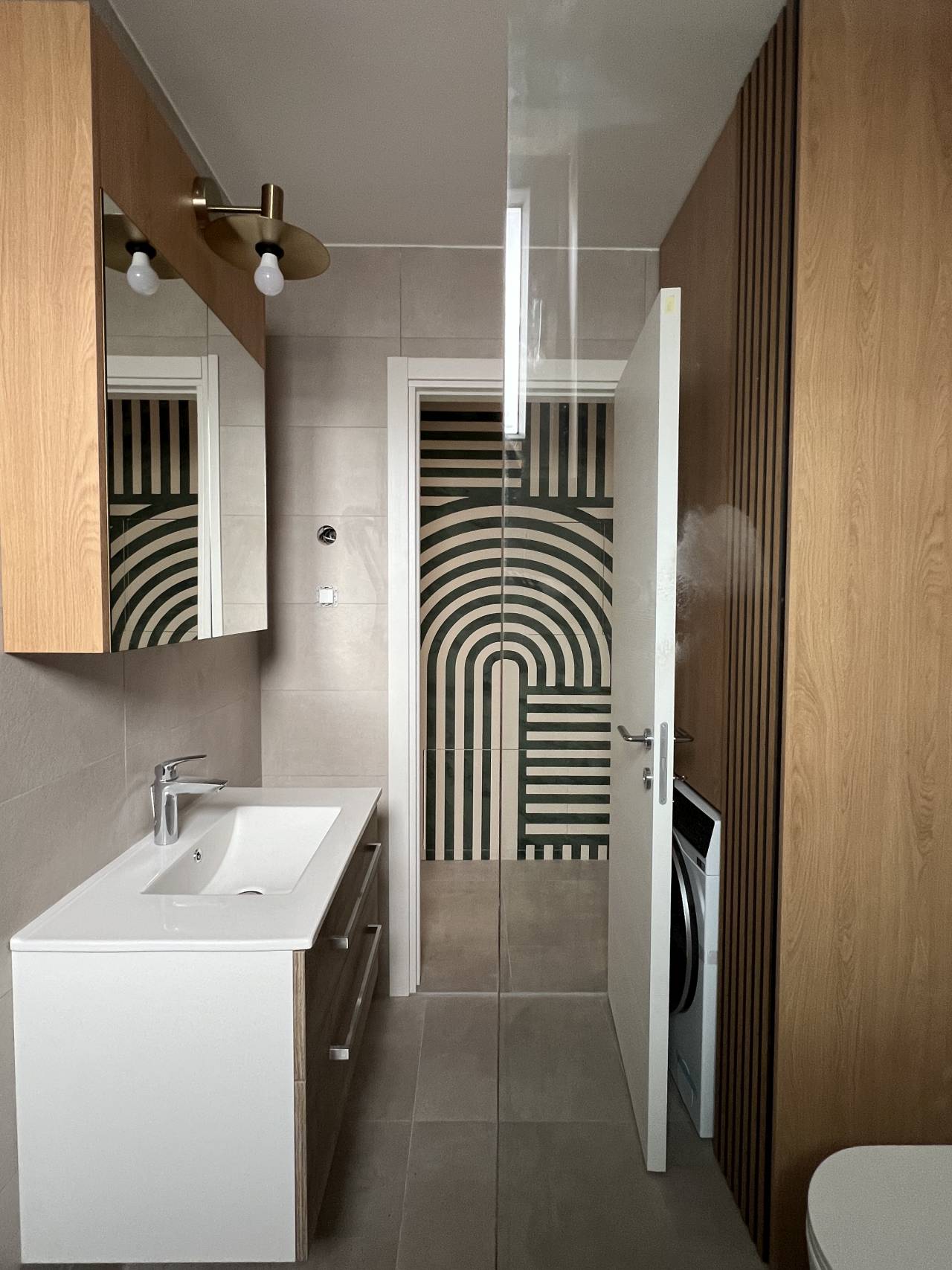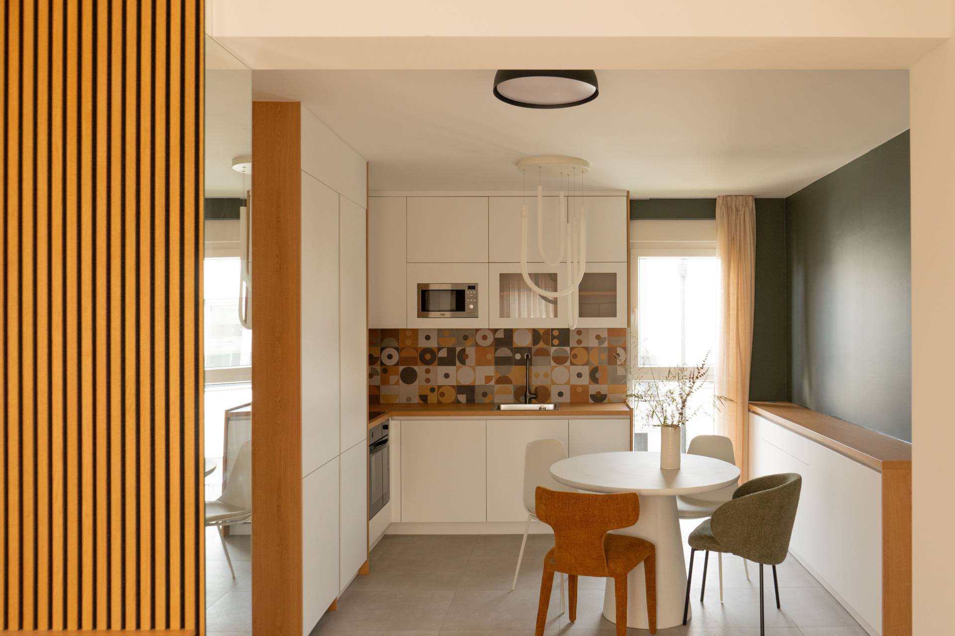U tom kontekstu uvedene su zidne kuhinjske pločice sa diskretnim geometrijskim motivima, koje unose blagi retro prizvuk, dok su dominantne akcentne nijanse narandžaste i tamnozelene.