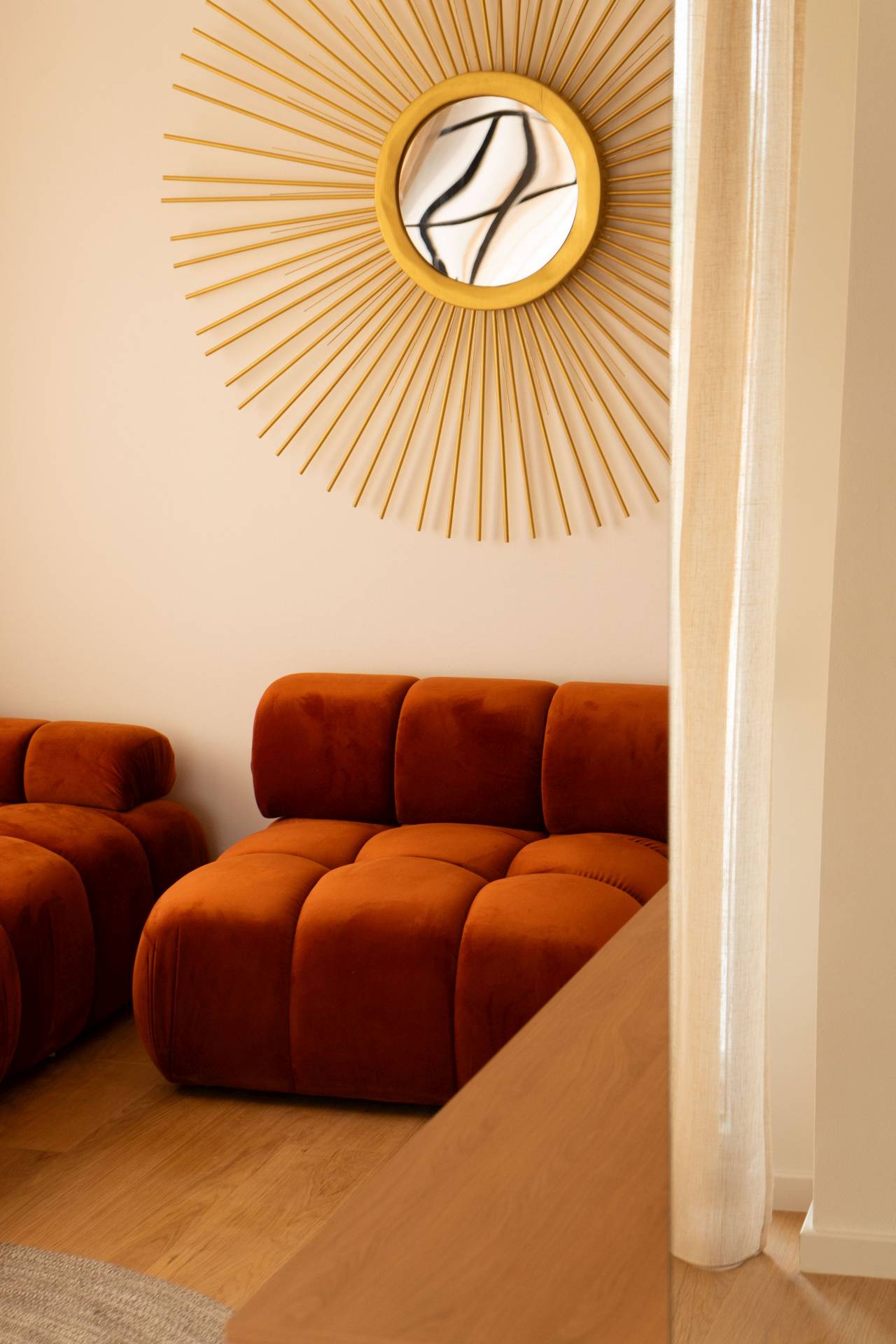 Jedan od ključnih izazova bio je izdužen dnevni boravak, koji je zahtevao vizuelnu ravnotežu. Problem je rešen velikim zidnim ogledalom kružnog oblika, koje ne samo da reflektuje svetlost već i “skraćuje” prostor, čineći ga prijatnijim za boravak.