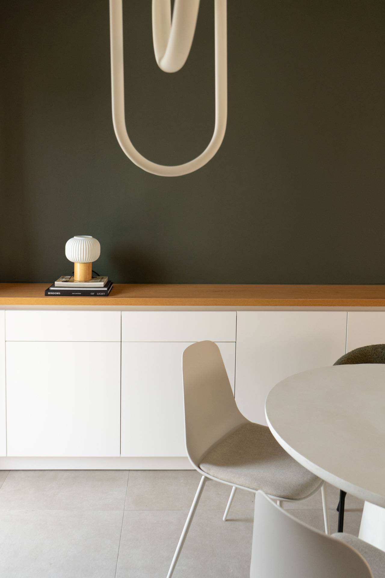 Umesto da se svi zidovi ispune elementima, odlučeno je da jedan krak ostane bez gornjih ormarića i da se taj deo zida oboji u tamnozelenu boju. Na taj način kuhinja postaje deo celine, a ne zaseban, dominantan segment prostora.