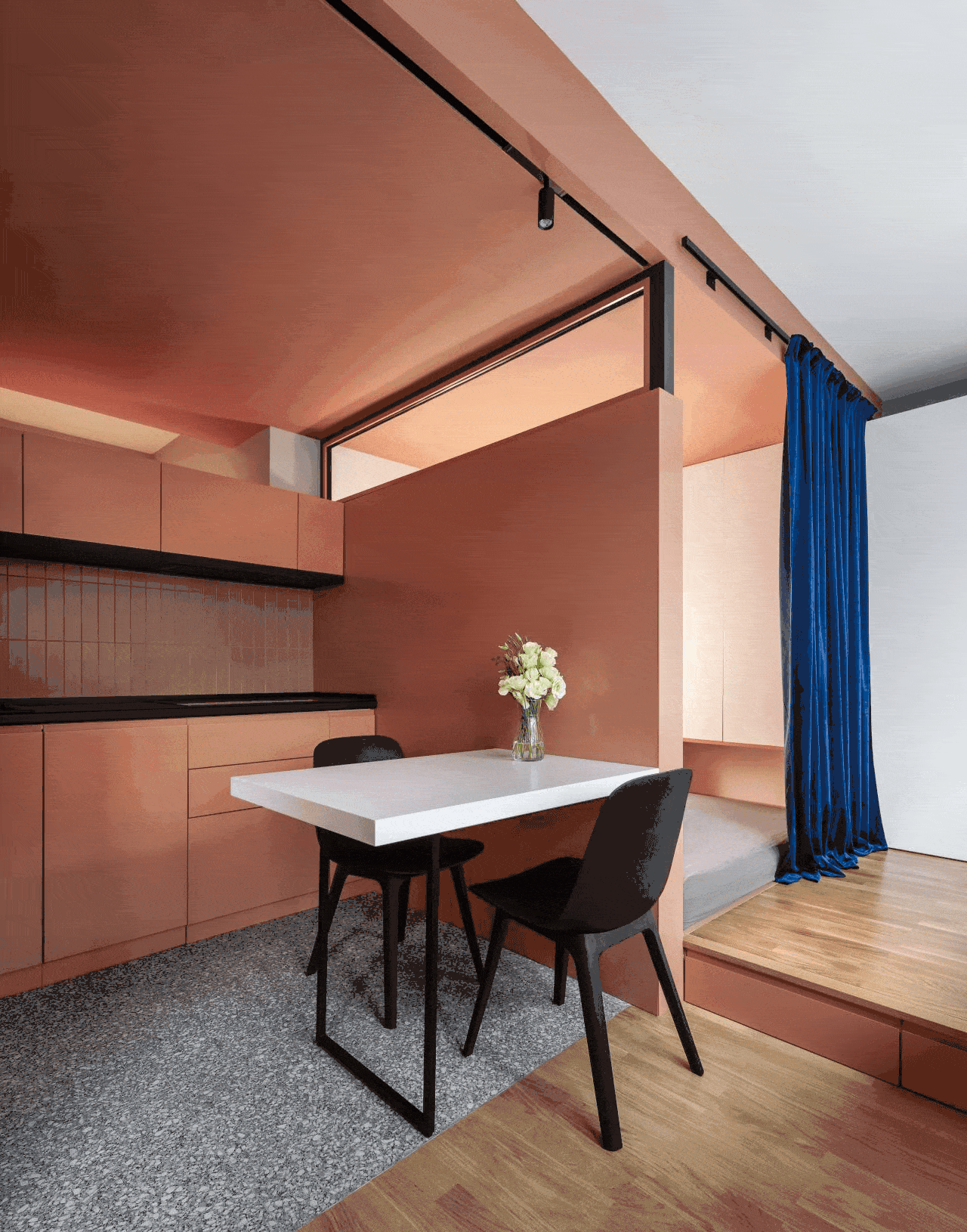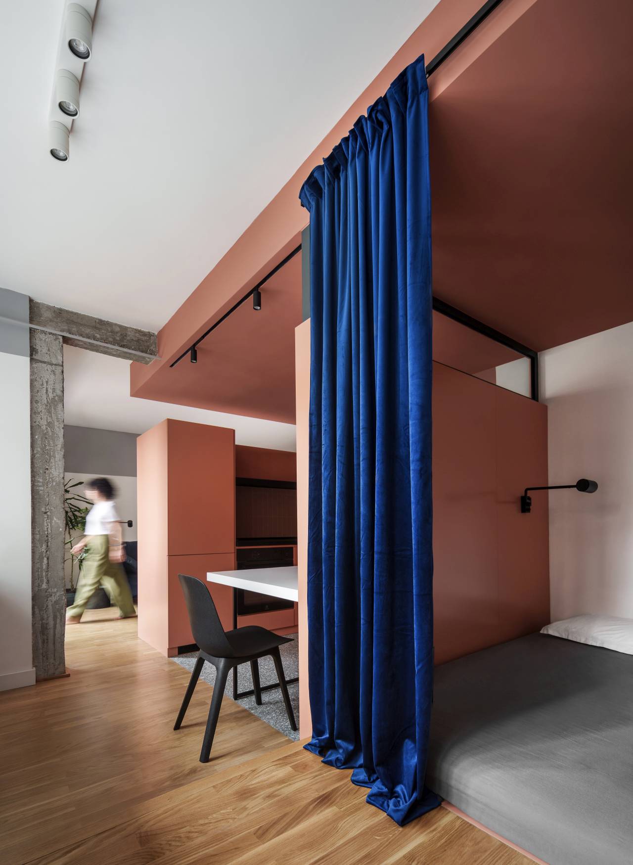 Umesto zasebne spavaće sobe kreirana je niša koja nudi dovoljno privatnosti, ali se ne odvaja trajno od ostatka stana. Plava zavesa uvodi meku granicu, a spuštene pregrade čuvaju osećaj širine.