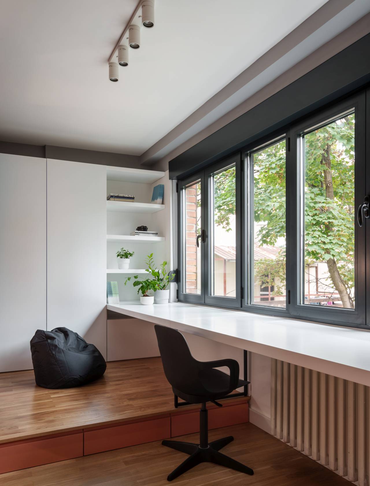 Duž prozora proteže se duga radna površina koja funkcioniše kao sto, polica ili dodatna zona za odlaganje. „Ideja je bila da maksimalno iskoristimo prirodno svetlo i širinu sobe“, navode arhitekte.