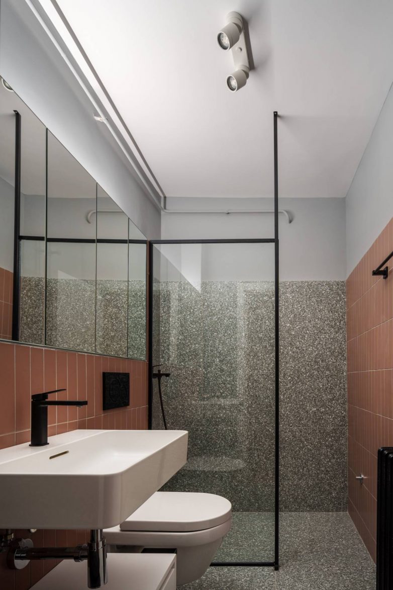 Terakota pločice i teraco površine iz ostatka stana pojavljuju se i u kupatilu, pa prostor deluje ujednačeno. Crni detalji služe kao akcenti, dok ogledala preko cele širine vizuelno proširuju prostor. Ovaj deo stana zadržava istu logiku – jasni materijali, bez suvišnih elemenata.
