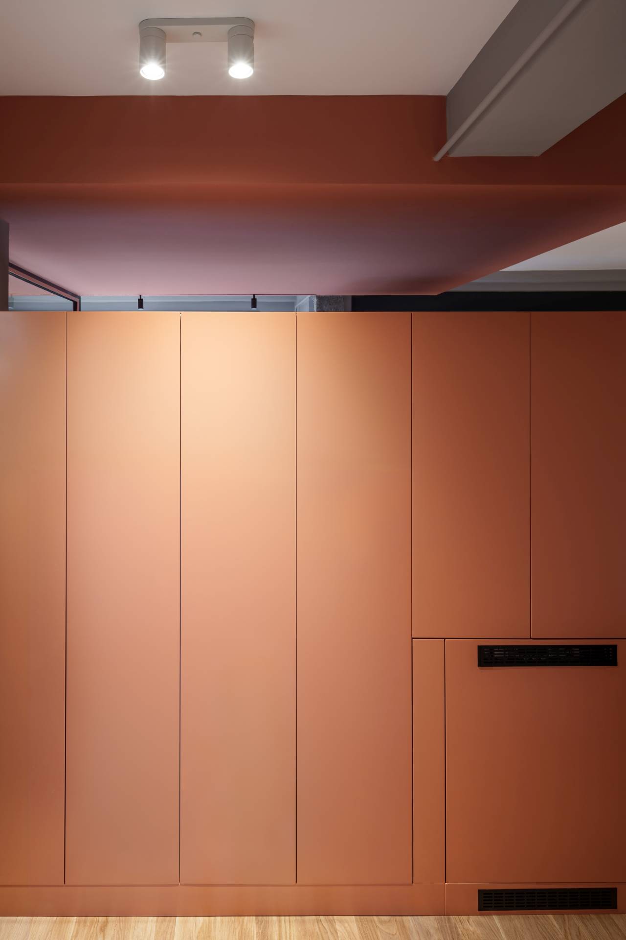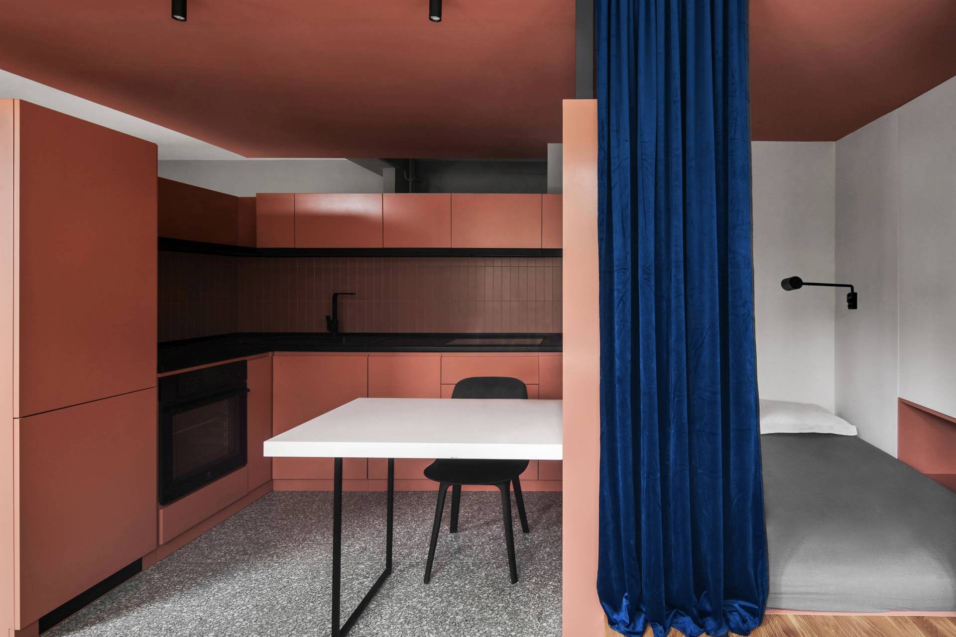 Kuhinja je projektovana kao kompaktan blok sa ravnim frontovima u istoj terakota nijansi, čime se uklapa u ostatak enterijera. Tamni radni pult uvodi kontrast, a linearna keramika daje suptilnu teksturu.