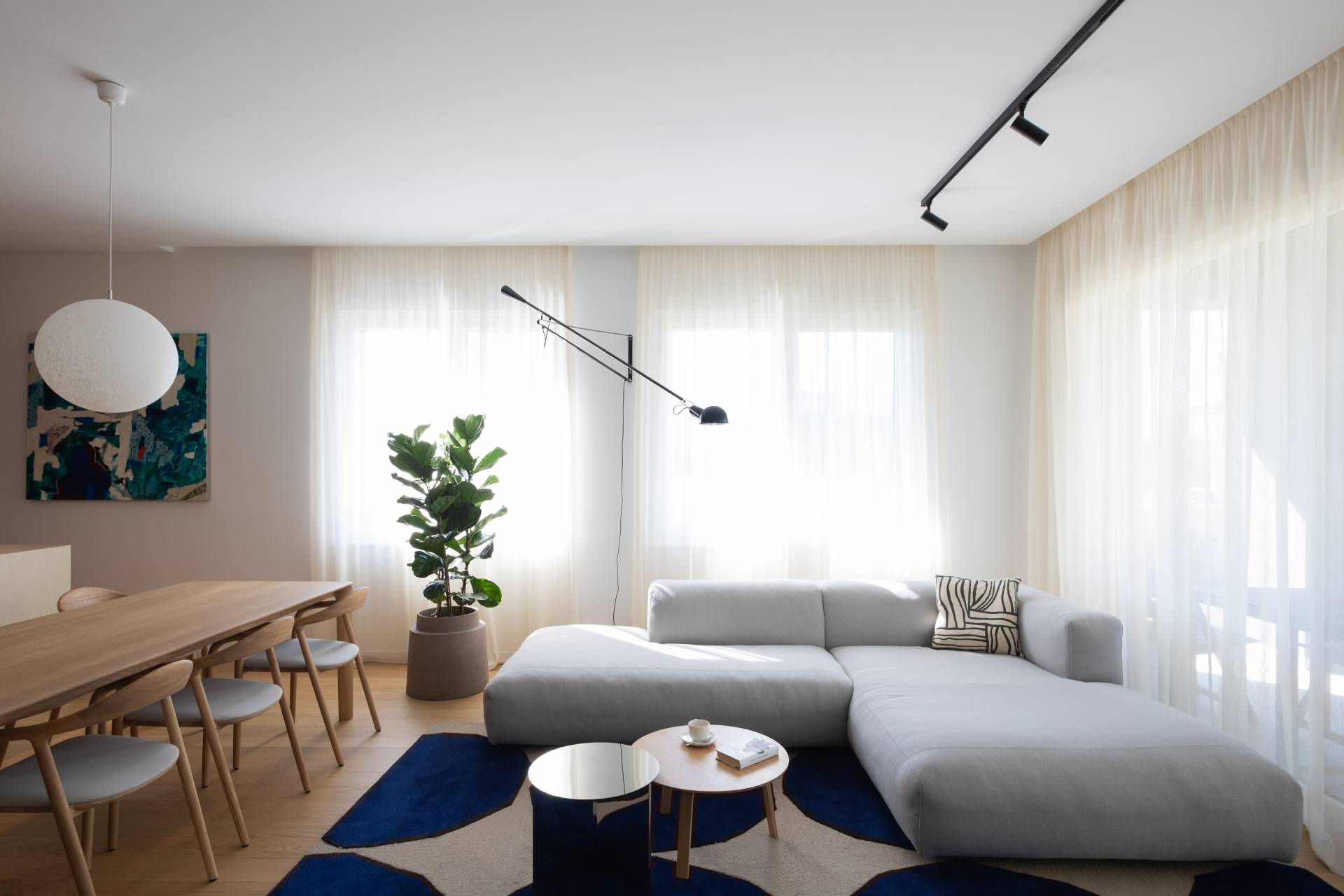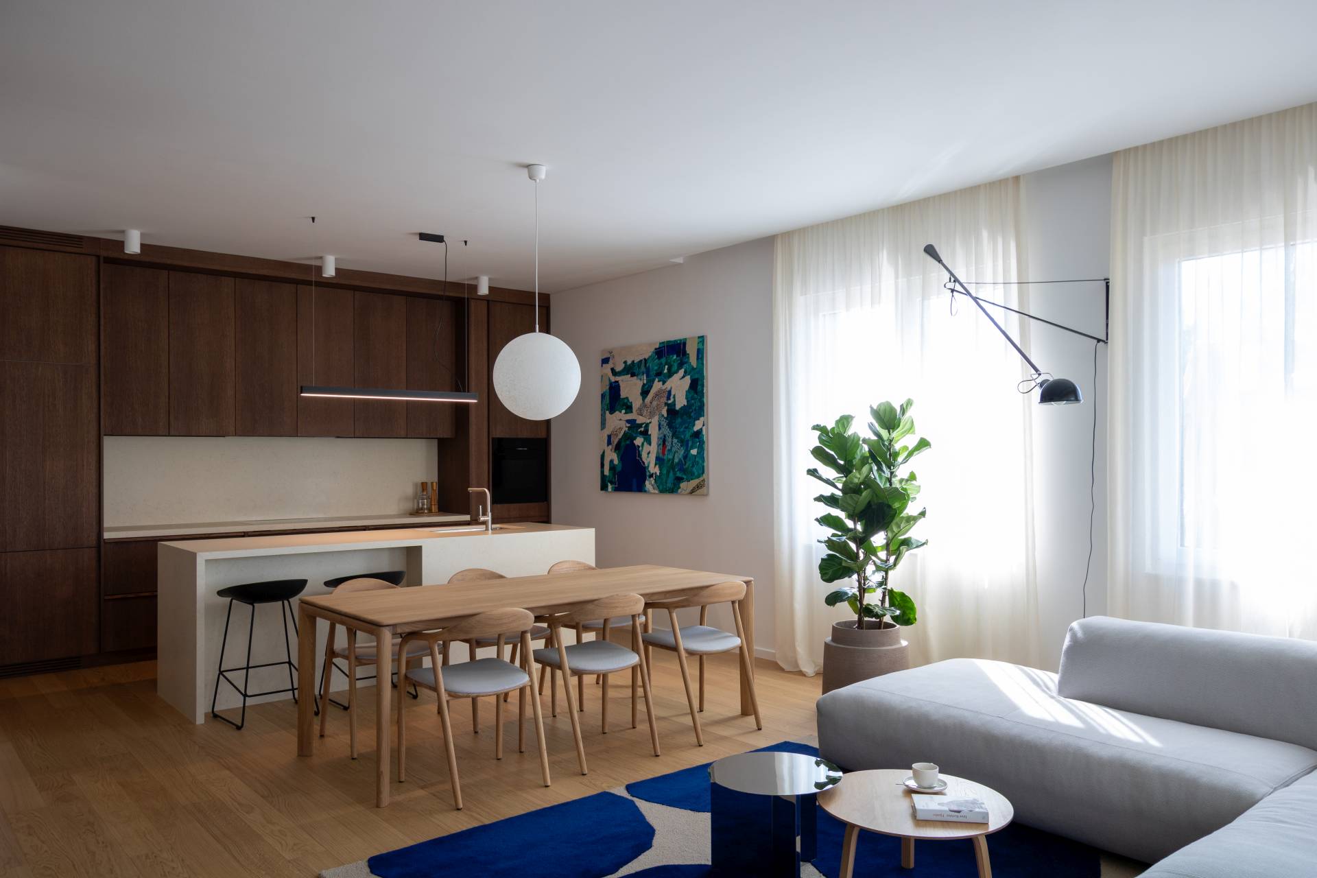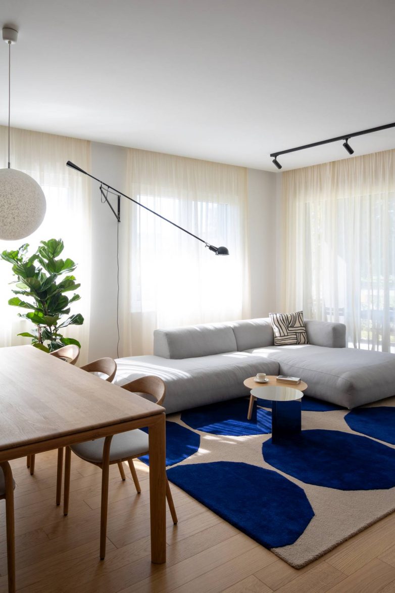 Lični favorit autorke projekta je plavi tepih u dnevnoj zoni, koji snažno, ali nenametljivo komunicira sa umetničkim delom u trpezariji i daje prostoru prepoznatljiv identitet.