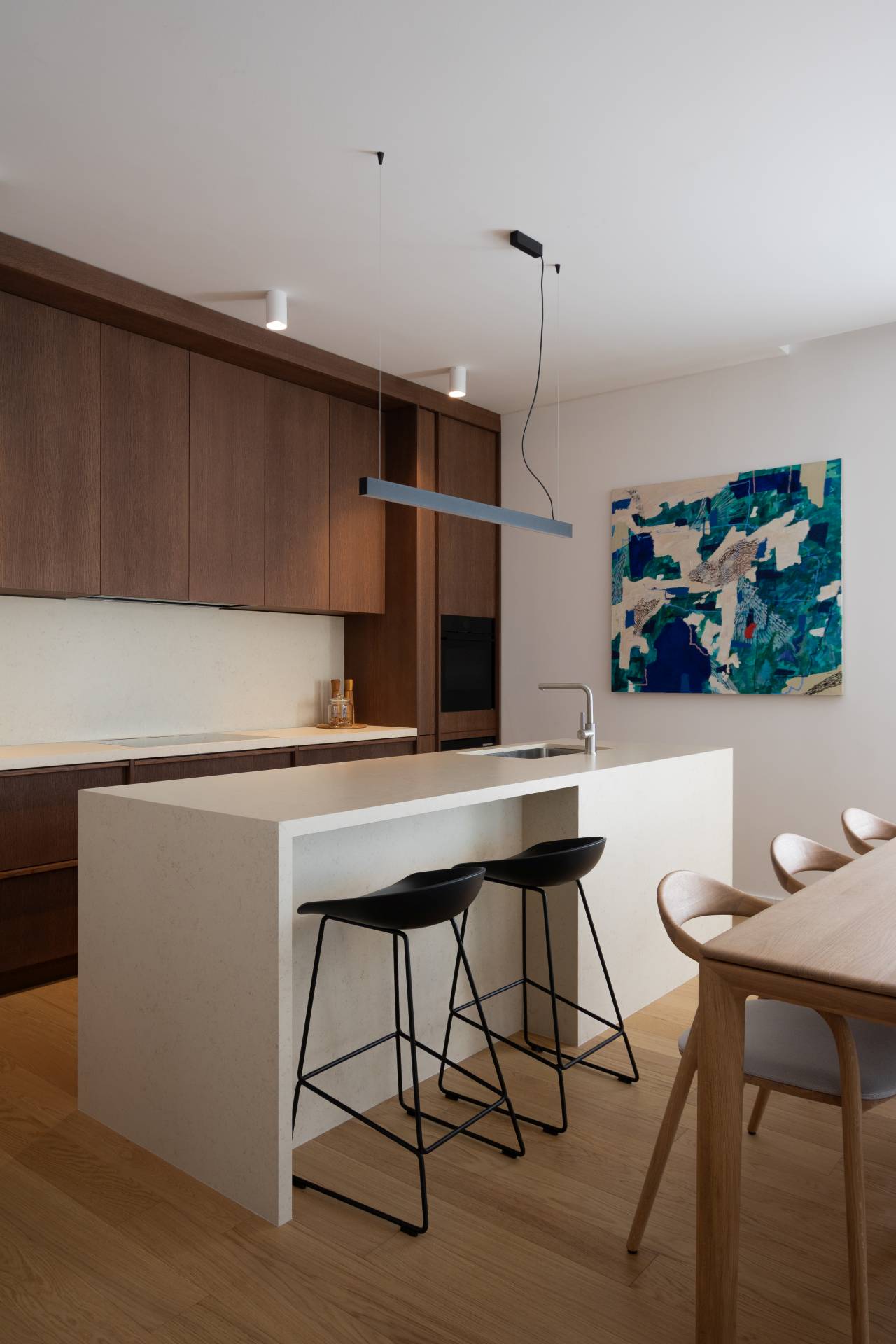 U procesu projektovanja bilo je važno da prostor odgovori na životne navike korisnika. Veliki kameni šank i trpezarijski sto bili su neizostavni elementi, s obzirom na to da porodica često okuplja prijatelje i rodbinu.