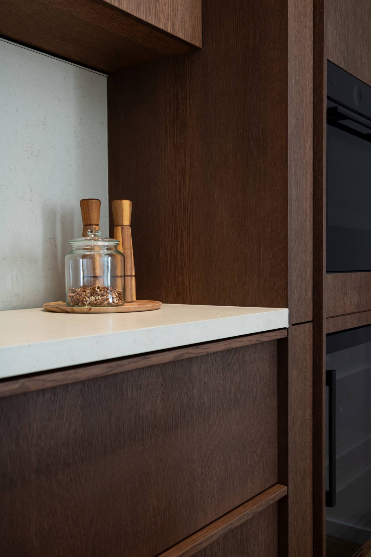 Za sve stolarske elemente odabran je tamniji furnir bajcovan u tonu oraha, čime je postignut klasičniji i ozbiljniji izraz, dok je svetliji bež kamen uveden kao kontrapunkt i vizuelno olakšanje.