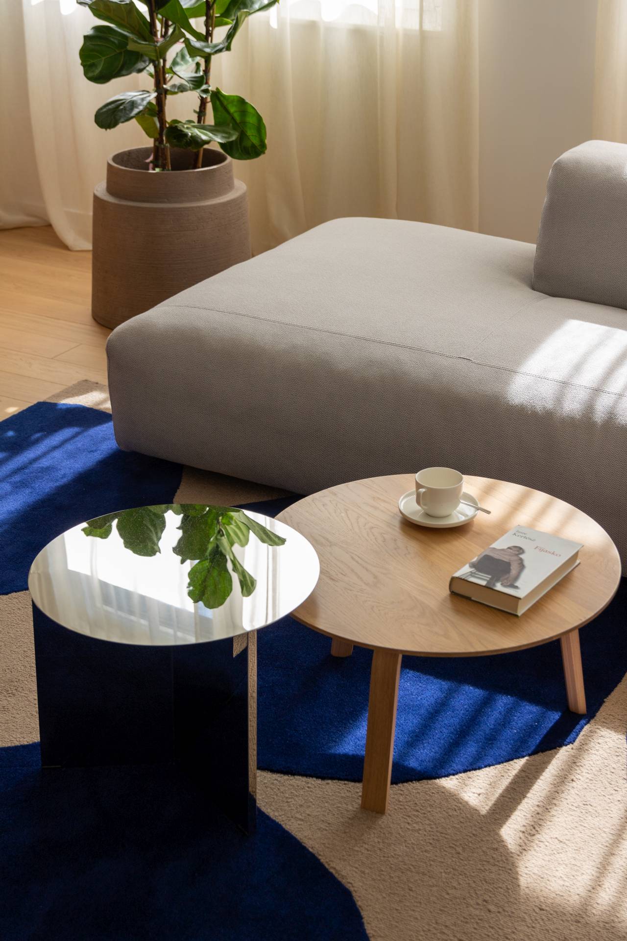 Koloristički akcenti pažljivo su dozirani. Zelena i plava boja pojavljuju se u detaljima, tekstilu i umetničkim delima, dok se zemljani tonovi provlače kroz čitav stan, dodatno naglašavajući vezu sa prirodom.