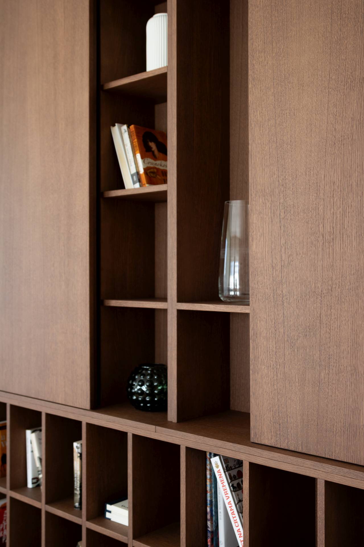 Jednako značajna bila je i biblioteka u dnevnom boravku, osmišljena kao funkcionalan, ali i snažan vizuelni akcenat, jer su vlasnici stana veliki ljubitelji knjiga.