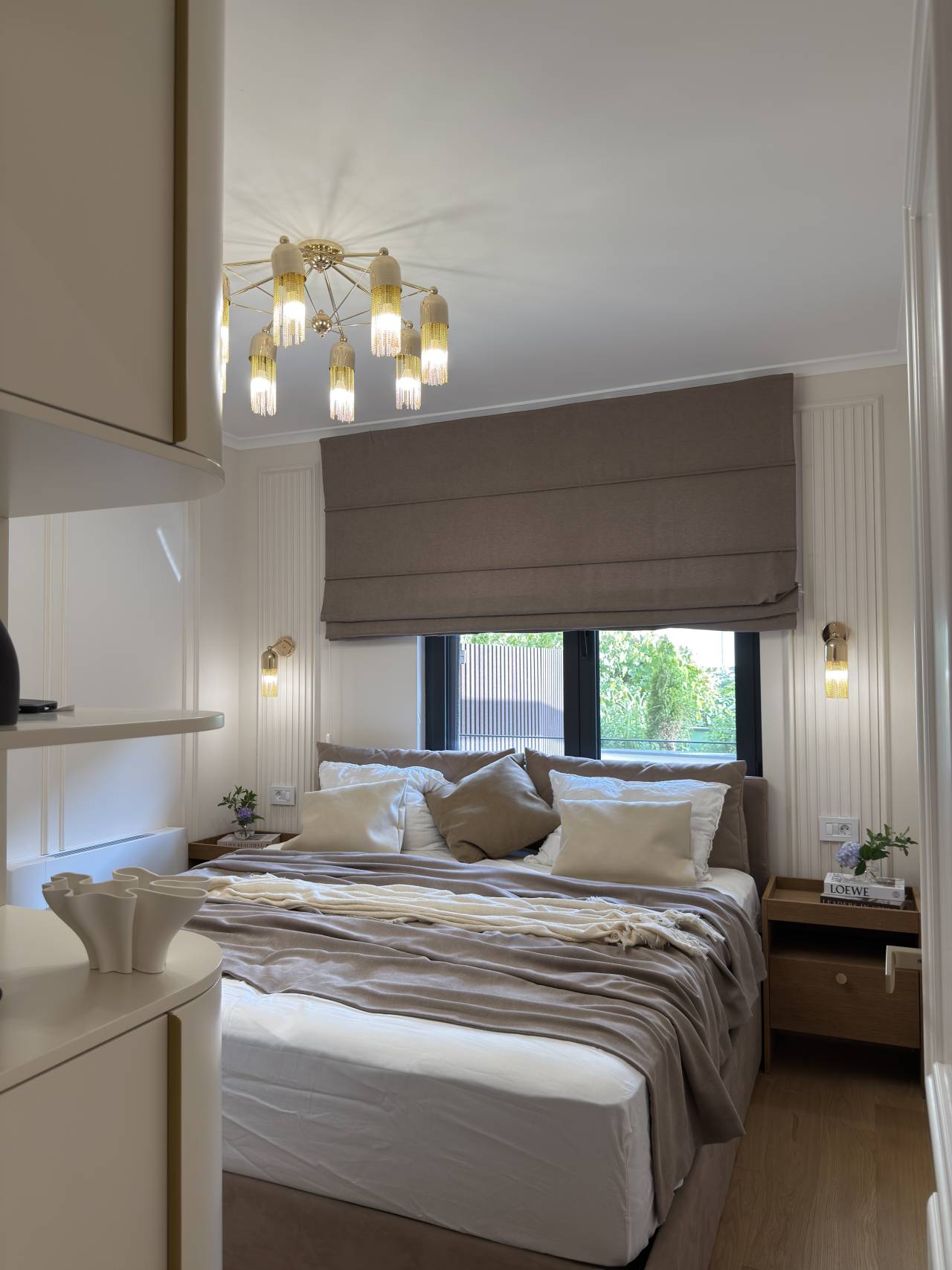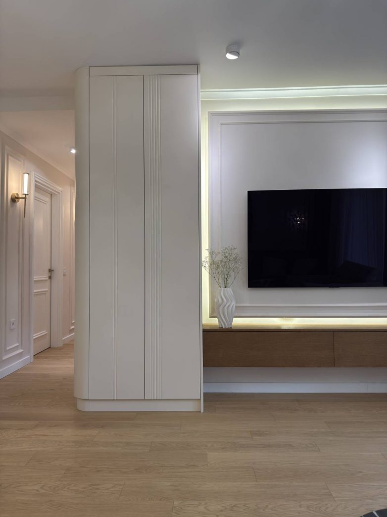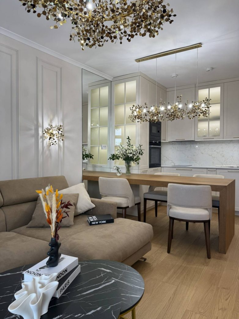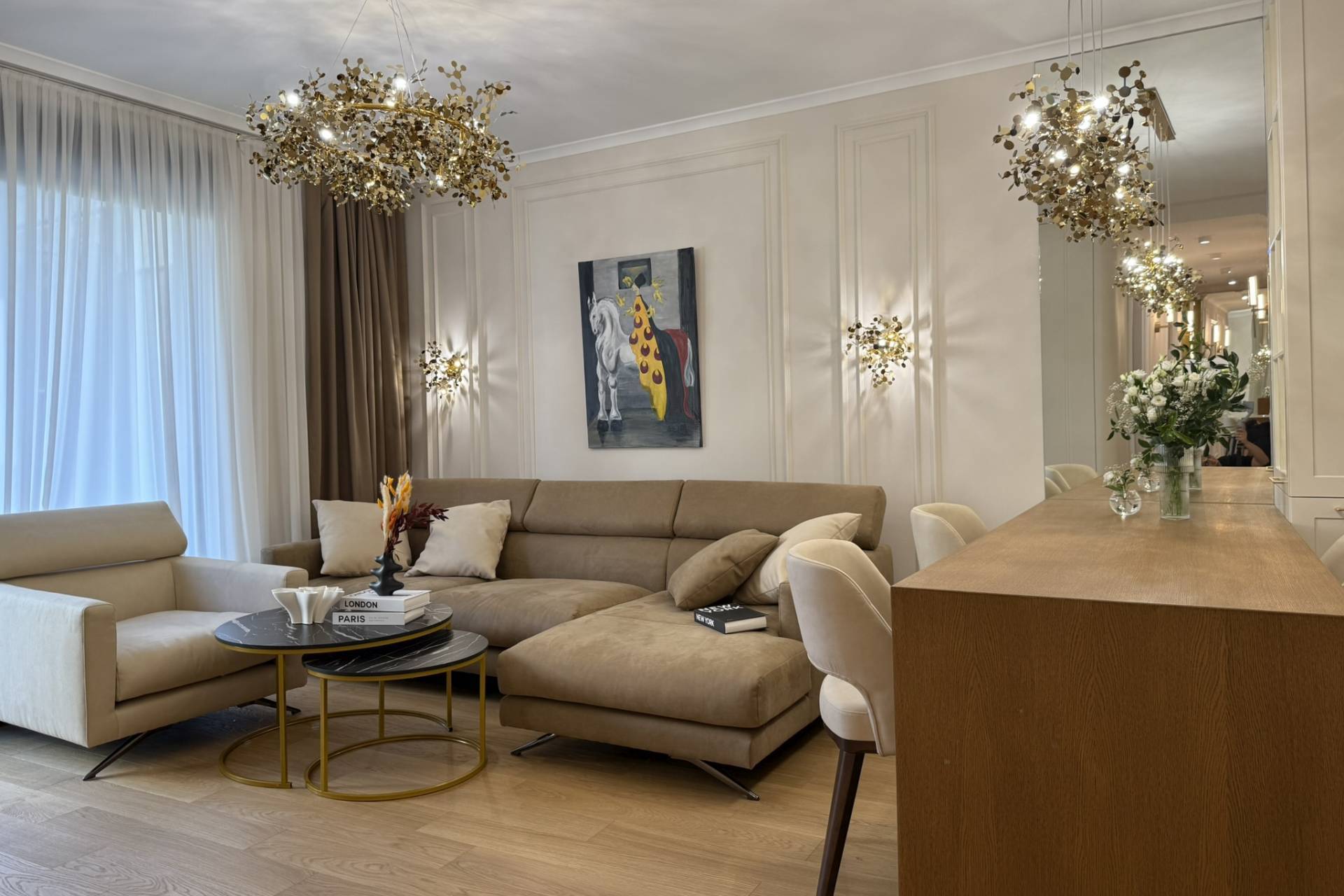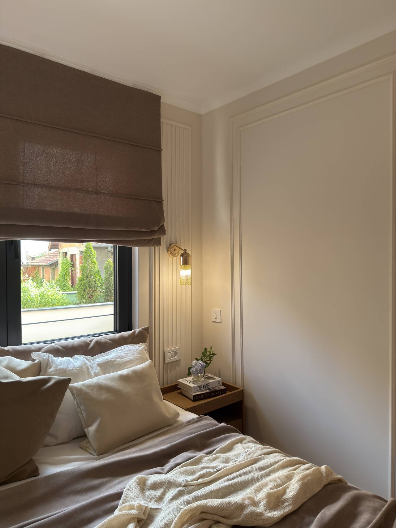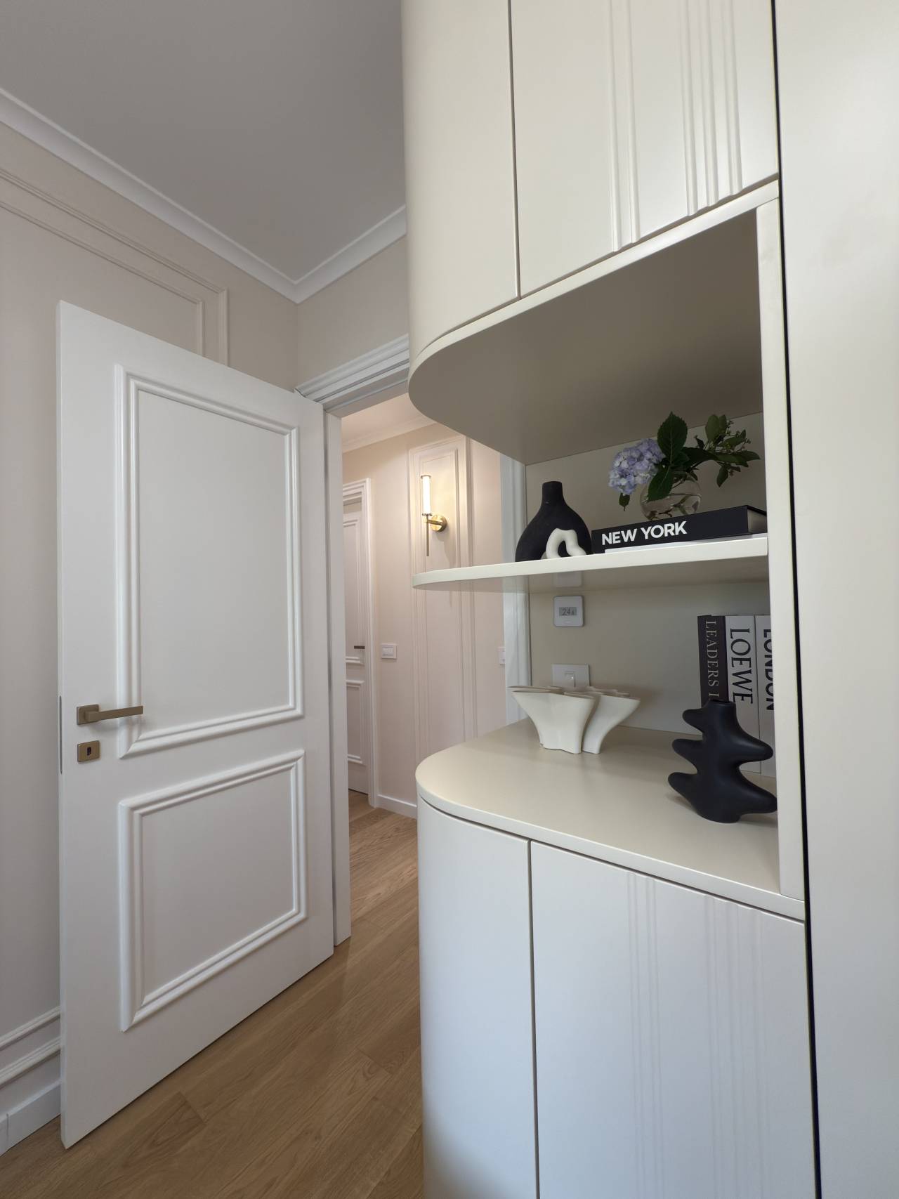 Na prvi pogled, ovaj porodični stan na Vračaru od 65 kvadrata deluje smireno, elegantno i vrlo promišljeno. Neutralna paleta, klasične zidne lajsne i bogata rasveta stvaraju utisak bezvremenog enterijera, dok savremeni komadi nameštaja i jasna organizacija prostora čine da stan funkcioniše lako i prirodno u svakodnevnom životu.
