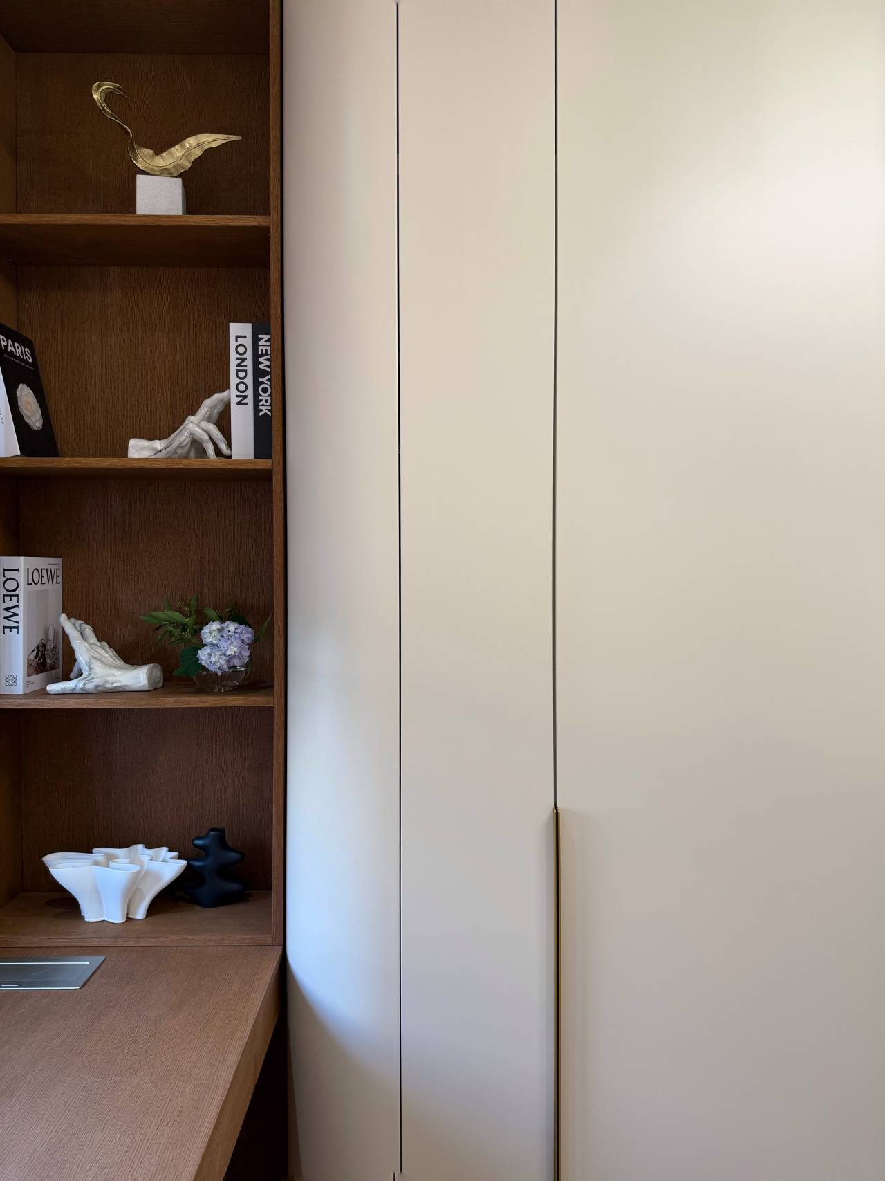 “Zidovi i nameštaj objedinjeni su u sličnim tonovima, čime je postignuta vizuelna celina, dok su akcenti uvedeni kroz tamni hrastov furnir i zlatne detalje na rasveti”, otkriva autorka.