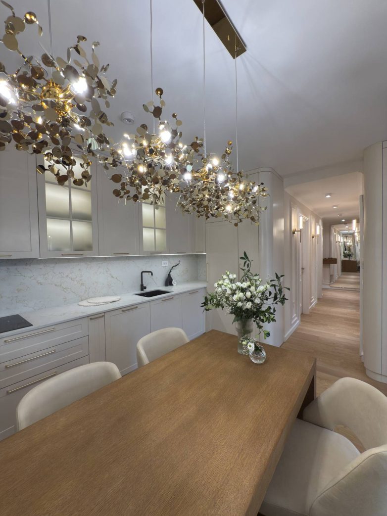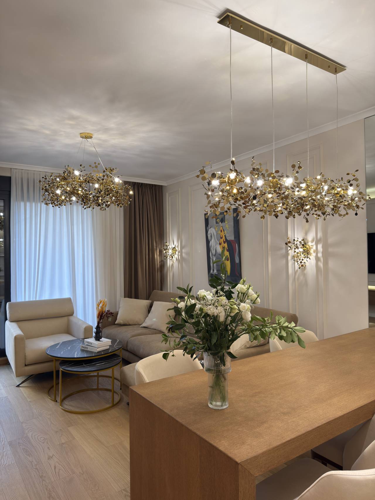 Rasveta ima jednu od ključnih uloga u ovom enterijeru. U dnevnoj zoni dominiraju upečatljive visilice u zlatnoj završnoj obradi, koje prostoru daju karakter i stvaraju zanimljivu igru svetla.