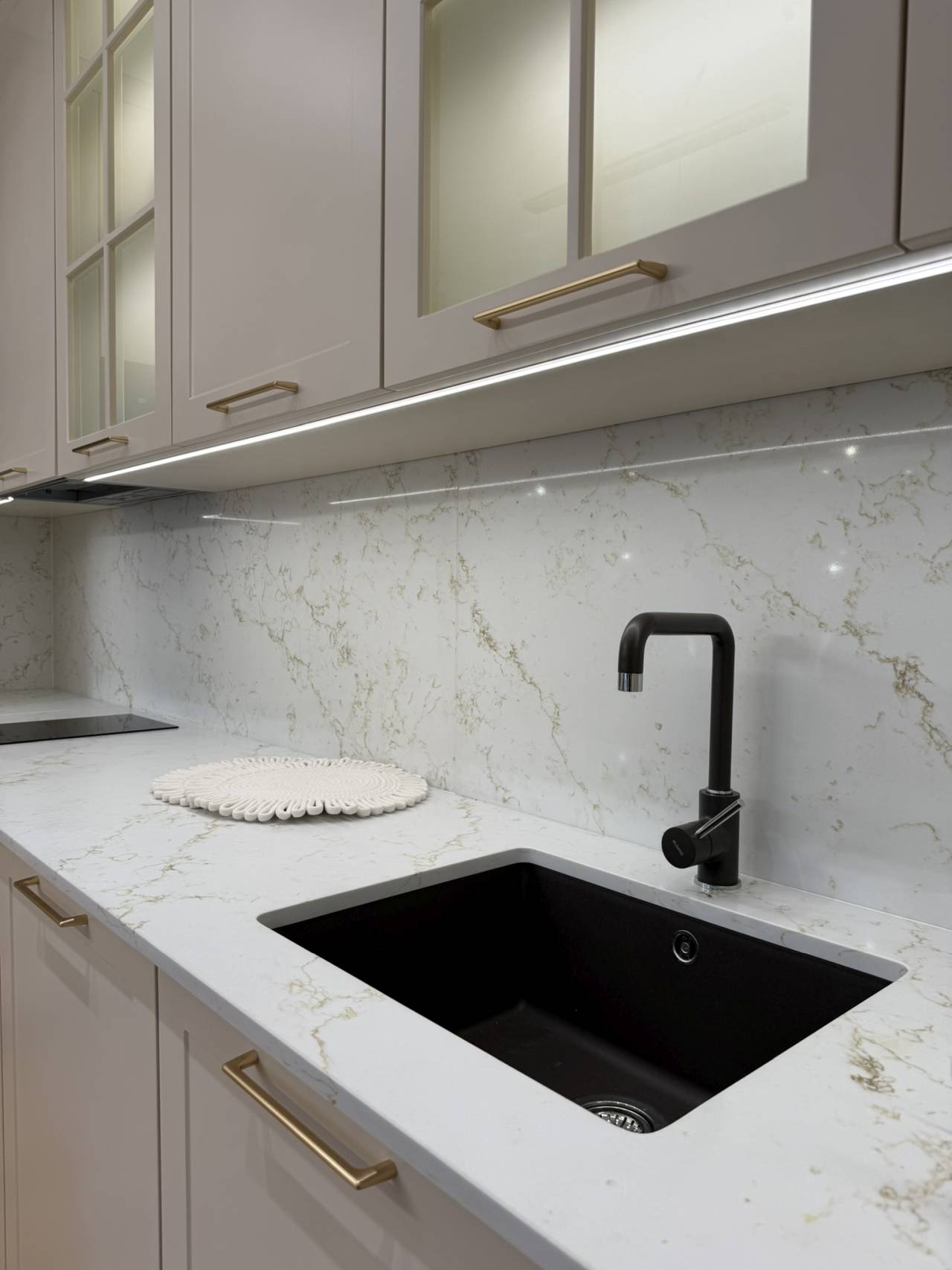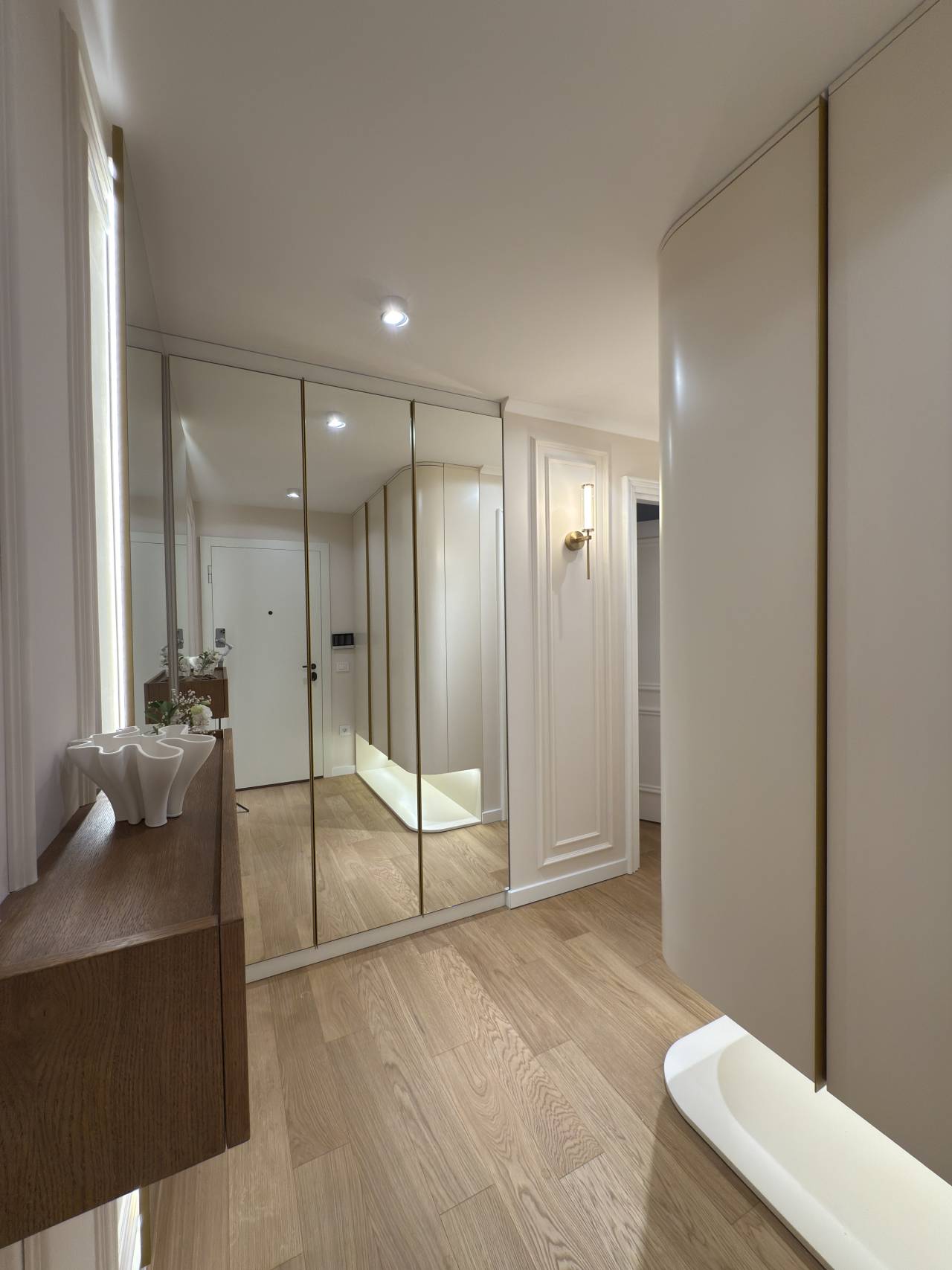 Vizuelno rasterećenje postignuto je korišćenjem “lebdećih” ormara i frontova obloženih ogledalima, koji reflektuju svetlo i čine prostor većim nego što zapravo jeste.