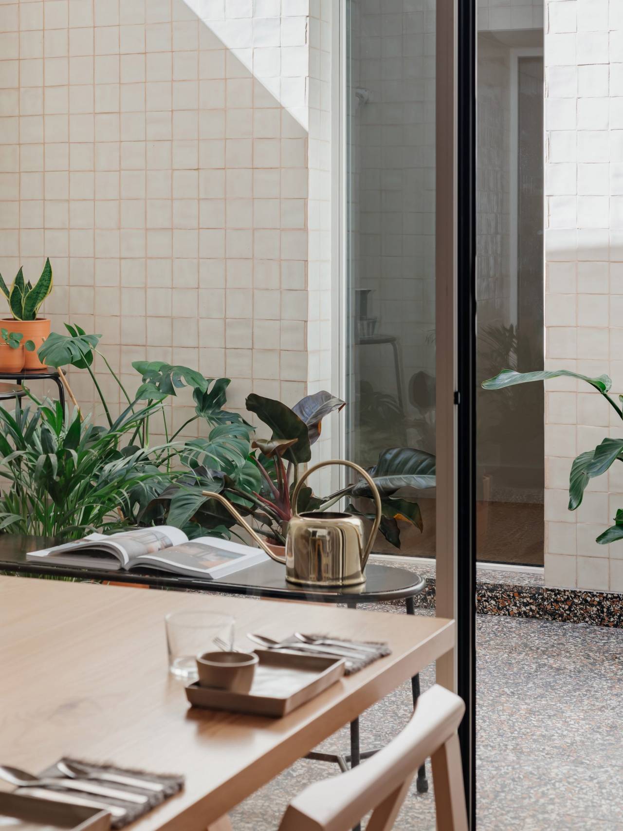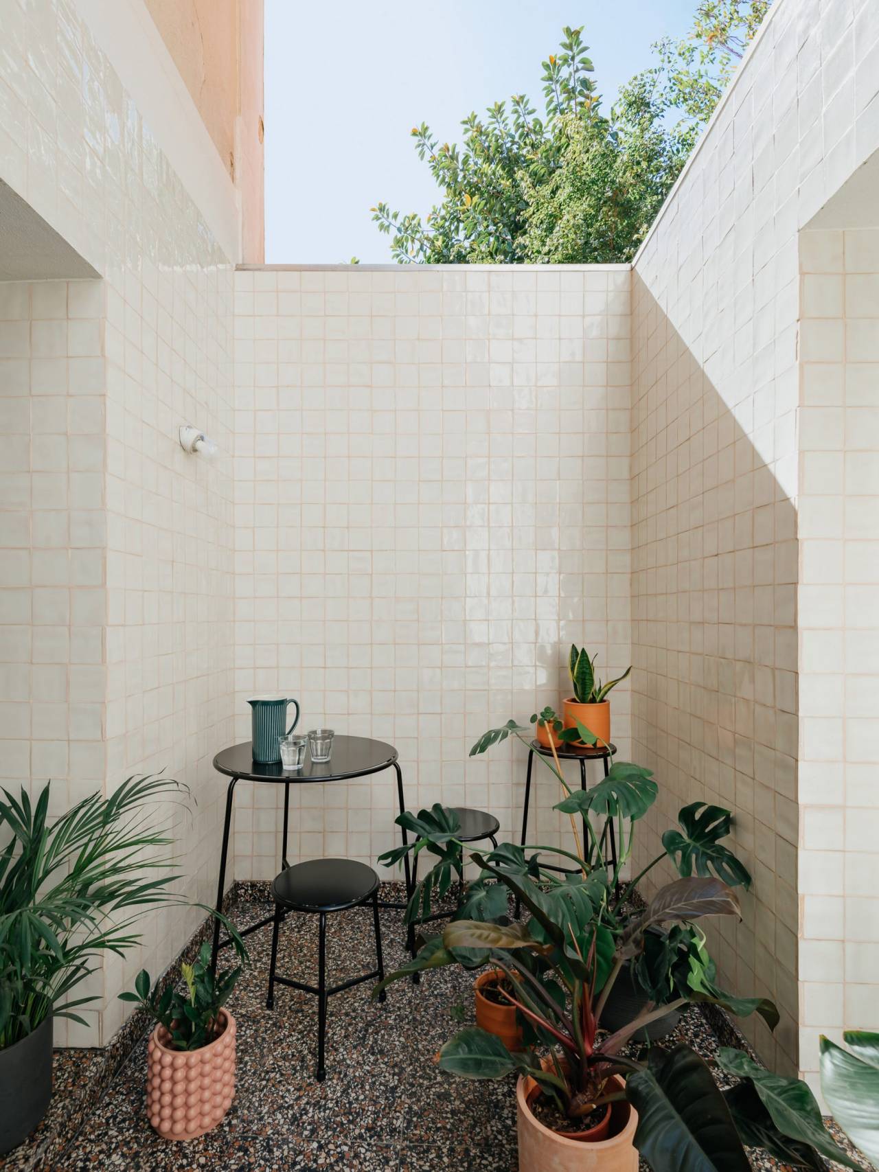 Izdužena vrata vode u novoformirano dvorište obloženo keramičkim pločicama i teracom. Crni čelični nameštaj i obilje biljaka daju mu identitet privatnog urbanog kutka, spoljašnje sobe koja se nastavlja na trpezariju.