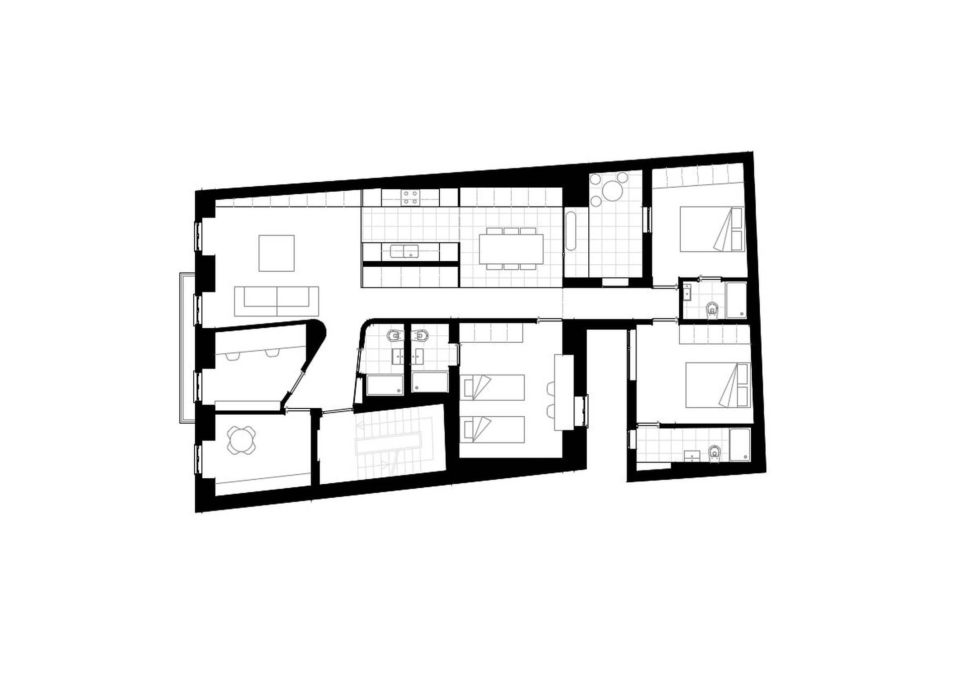 Stan je organizovan tako da se dnevne, „fluidne“ zone nalaze napred, dok su spavaće sobe i privatni prostori smešteni u zadnjem delu.