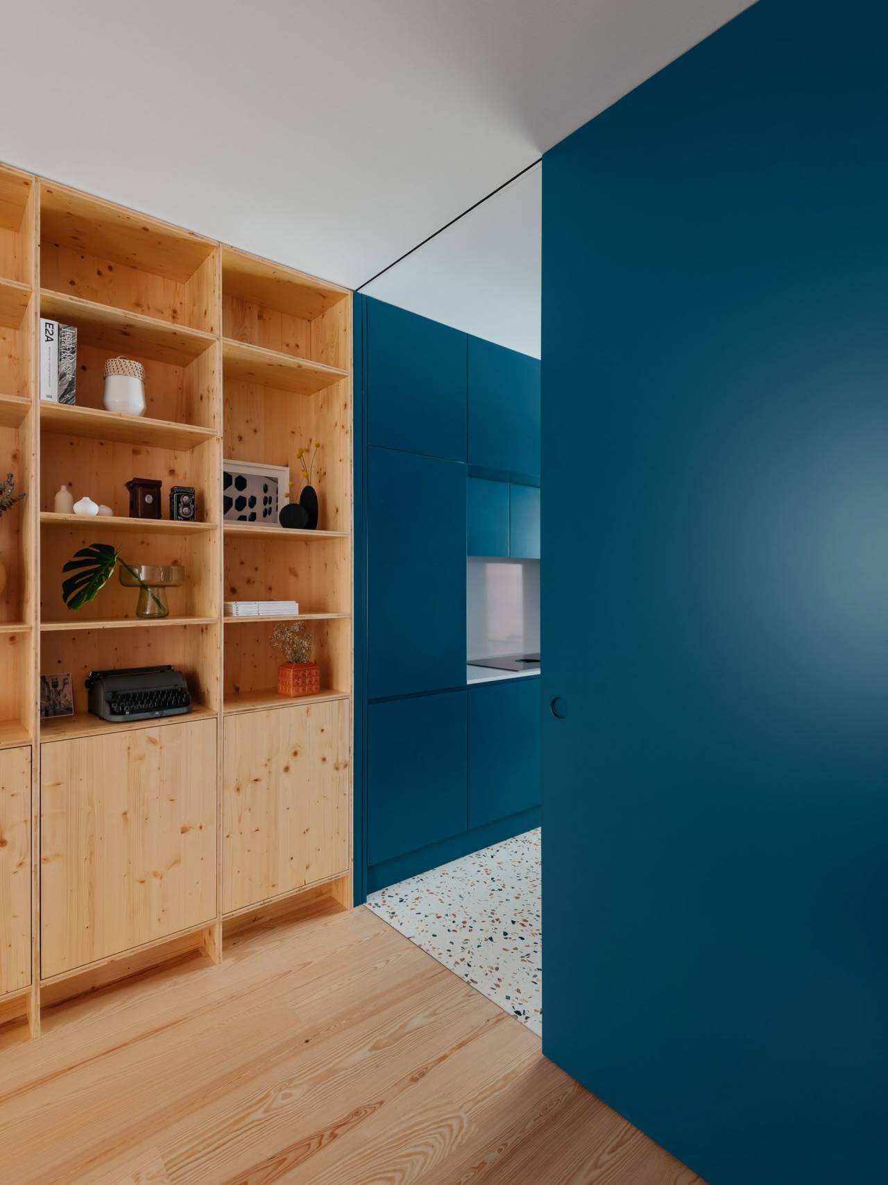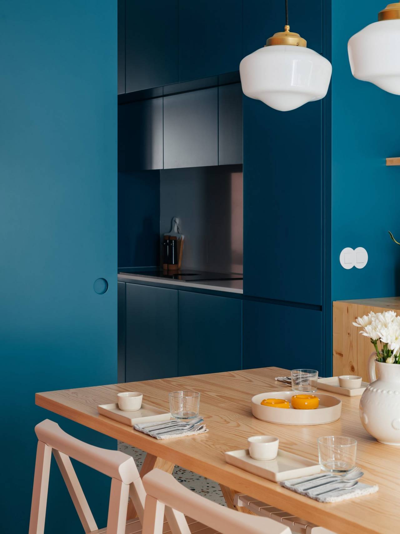 Iz dnevne zone klizna vrata vode u kuhinju osmišljenu kao kompaktnu celinu u dubokoj plavoj nijansi. Sa obe strane nalaze se visoki kuhinjski elementi sa metalnim radnim pločama, dok je pod prekriven teracom.