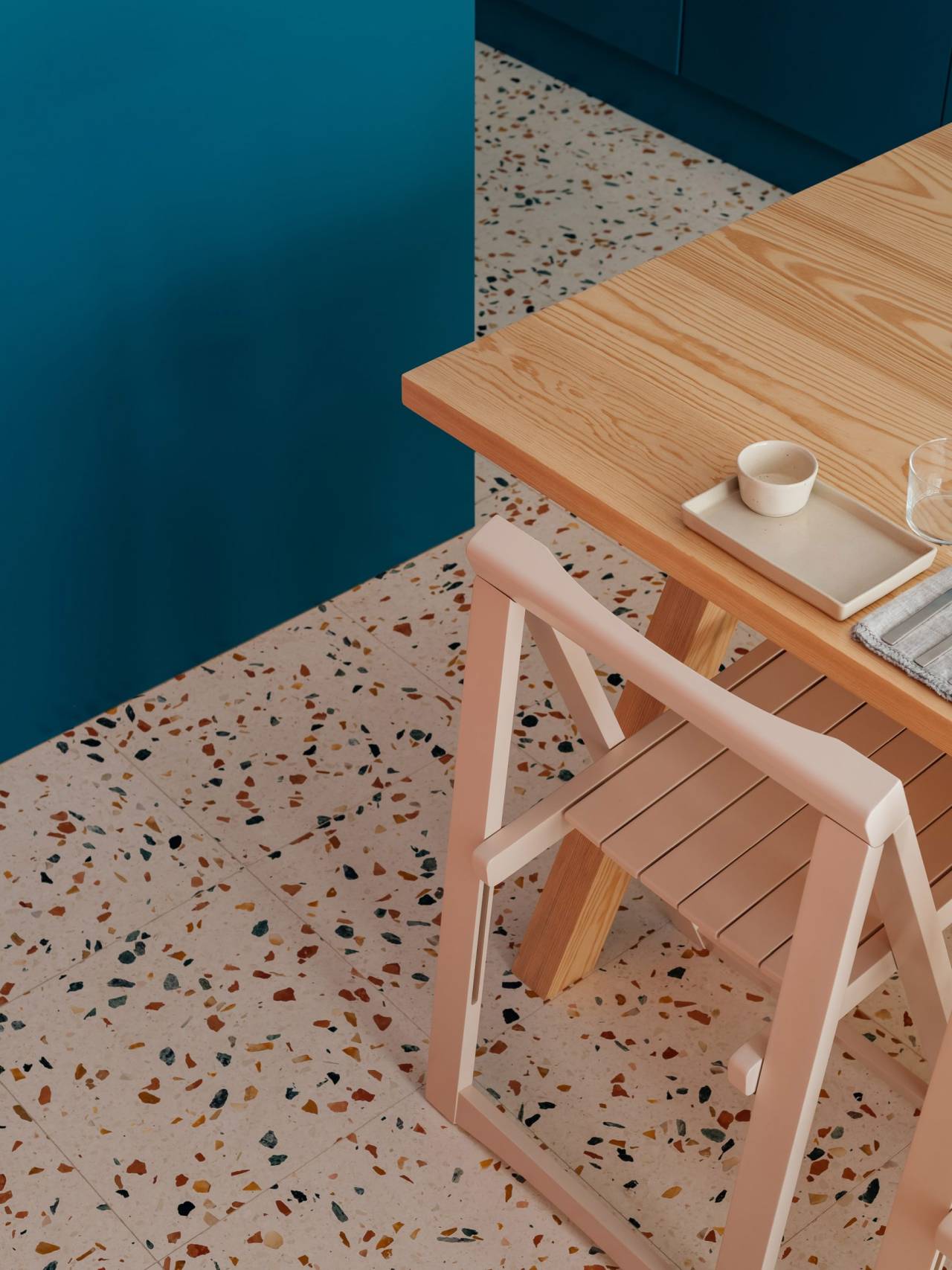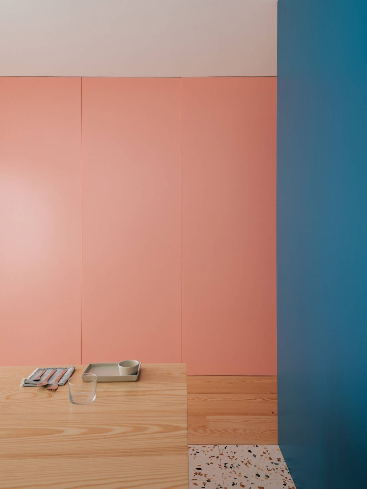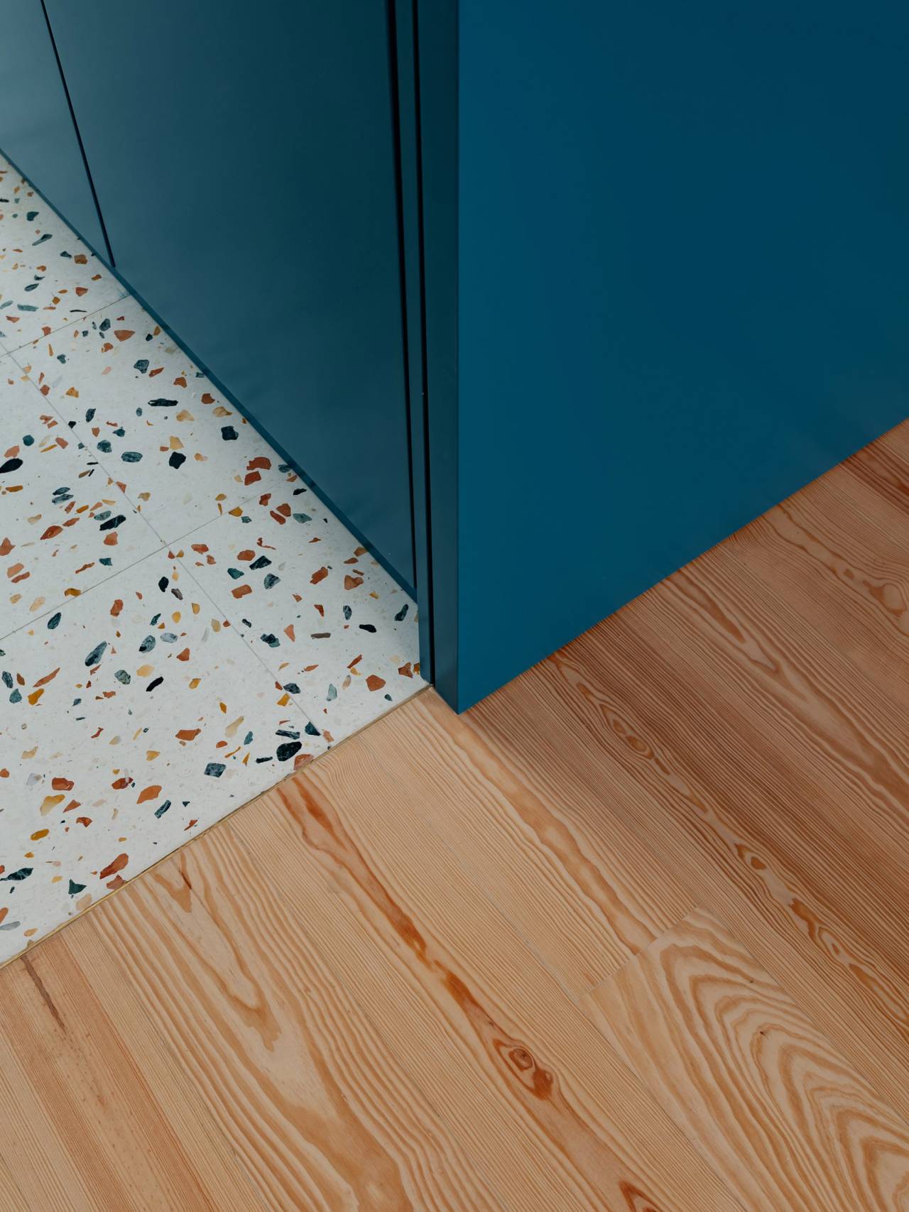 „Zamišljali smo kuhinju kao živopisnu fokusnu tačku, zato je ovaj kuhinjski boks tako upečatljivo obojen„, kažu autori. „Tražili smo hladne tonove koji će funkcionisati kao kontrast toplim nijansama borovine“, dodaju.