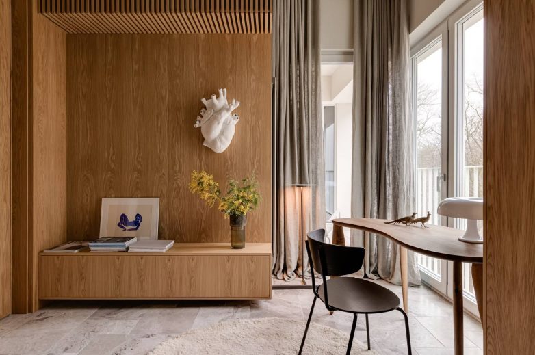 Dnevni deo je otvoren i protočan, dok je privatna zona pažljivo sakrivena. Vrata koja vode ka spavaćoj sobi i gostinskoj sobi gotovo su neprimetna, utopljena u zidne obloge od drveta.