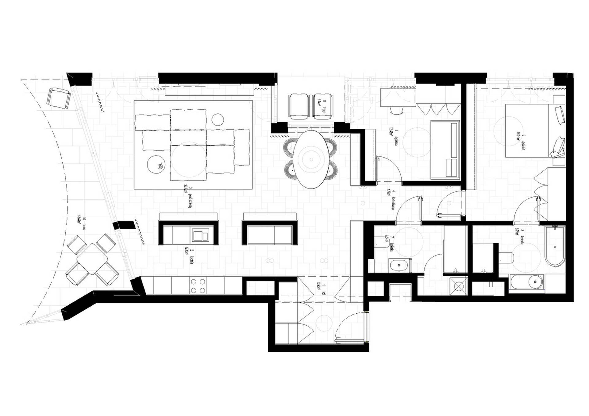 U samom središtu dnevne zone nalazi se ovalni kameni sto – centralna tačka stana i mesto okupljanja ukućana i gostiju. On povezuje sve delove enterijera, stojeći na granici između otvorene i intimnije zone.