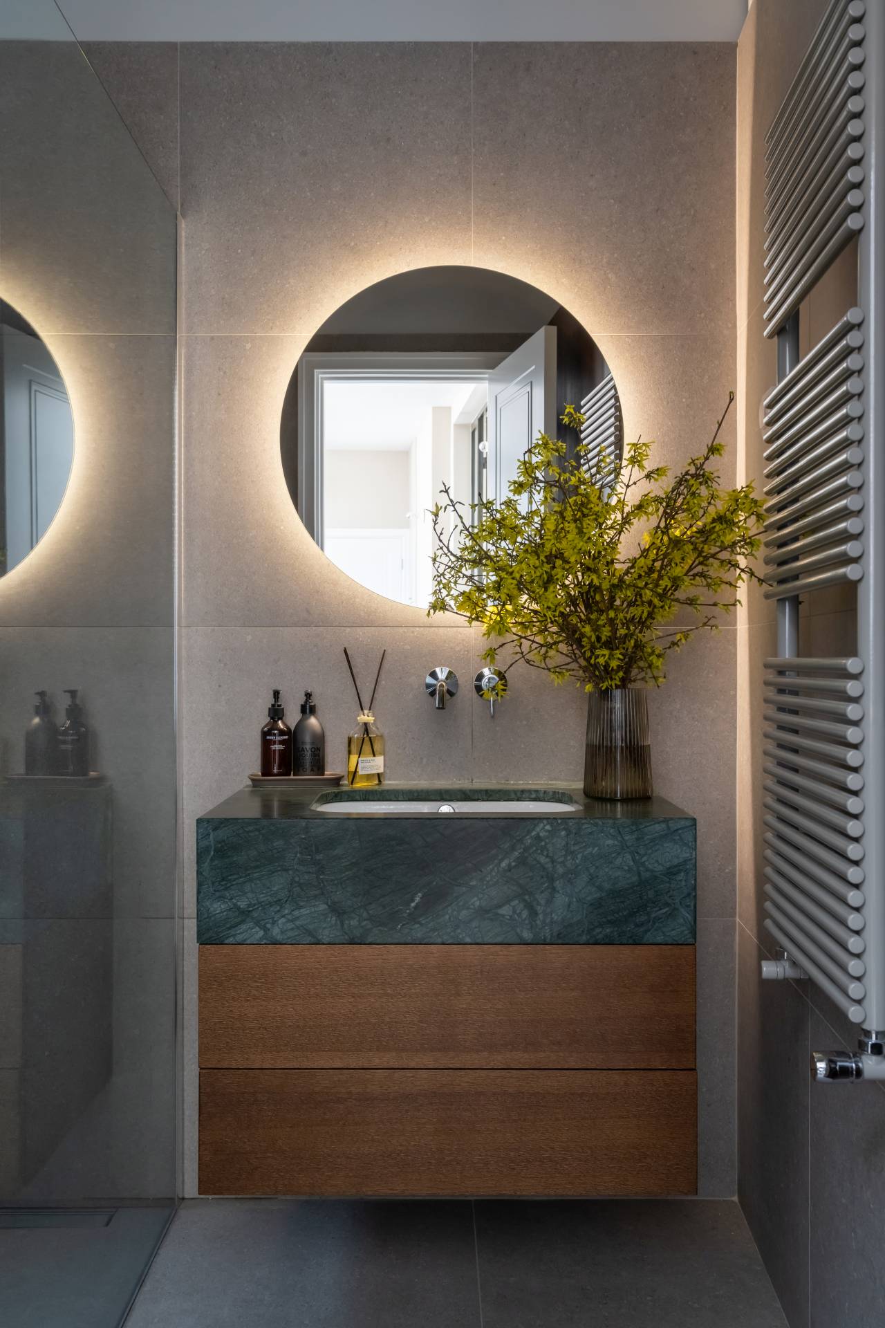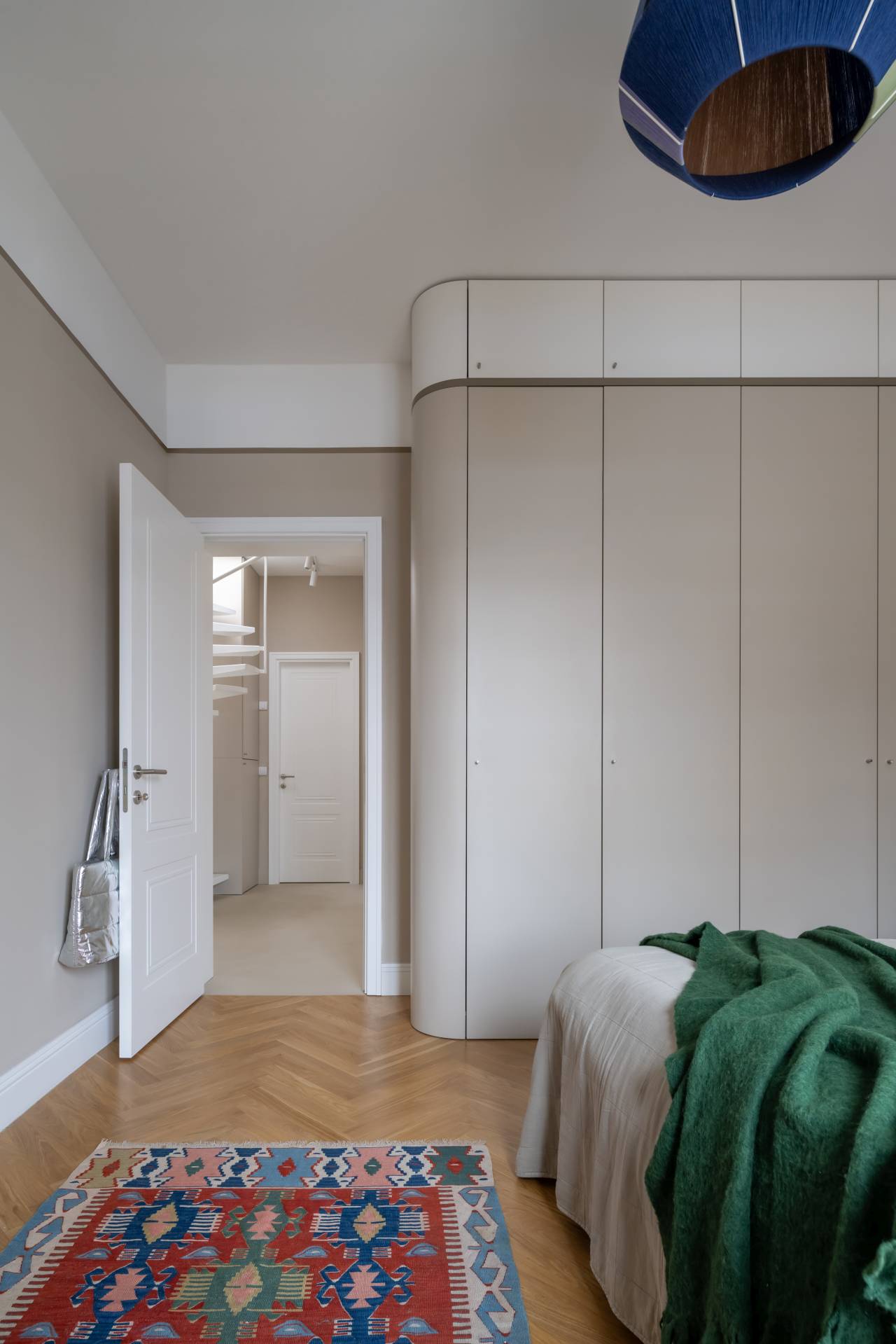 Materijalizacija enterijera pažljivo je birana kako bi povezala istorijski sloj stana sa savremenim dizajnerskim izrazom. Kombinacija punog drvenog parketa, izvedenog po uzoru na originalni, i mikrocementnog poda jasno diferencira funkcionalne zone, ali i doprinosi mirnom, ujednačenom karakteru prostora.
