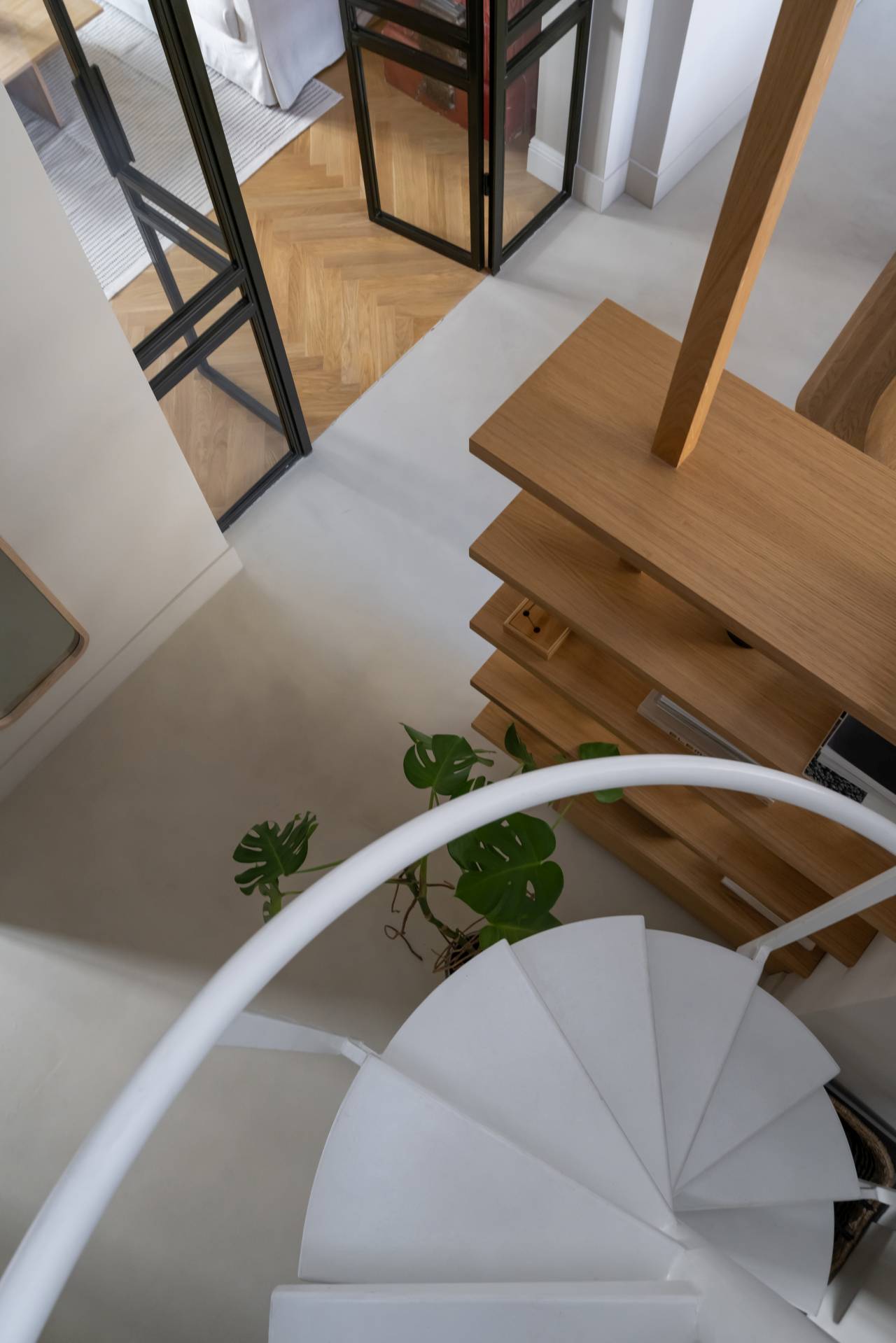 Kombinacija punog drvenog parketa i mikrocementnog poda jasno diferencira funkcionalne zone.
