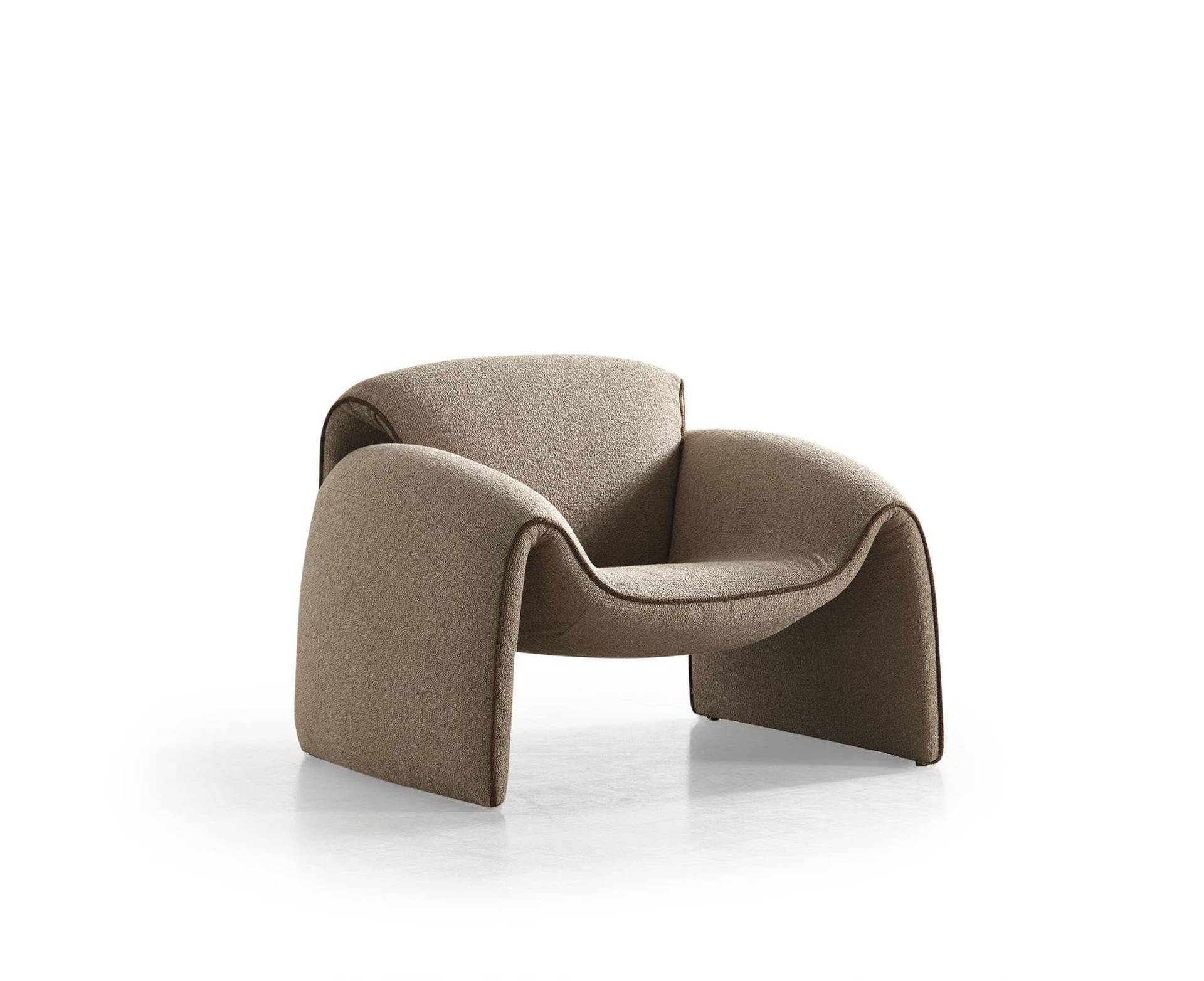 Široko sedište i zaobljeni nasloni naglašavaju osećaj udobnosti, dok sama forma deluje kao kompaktan volumen koji prirodno privlači pažnju.