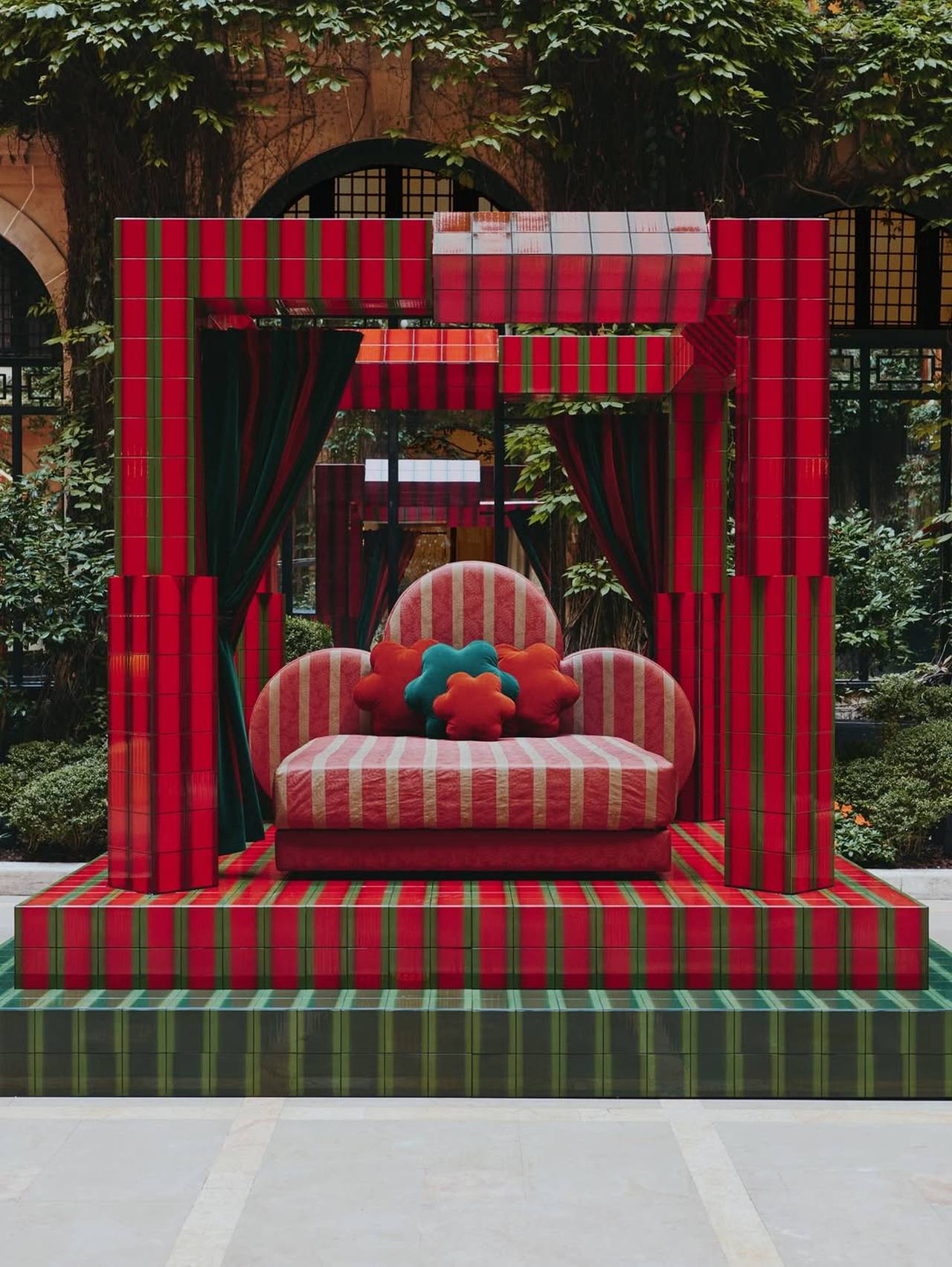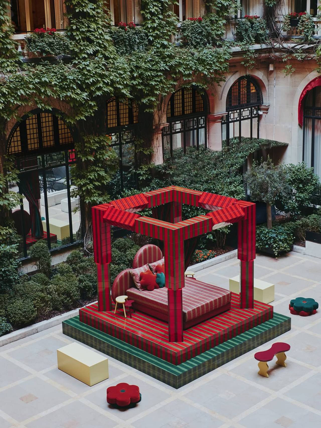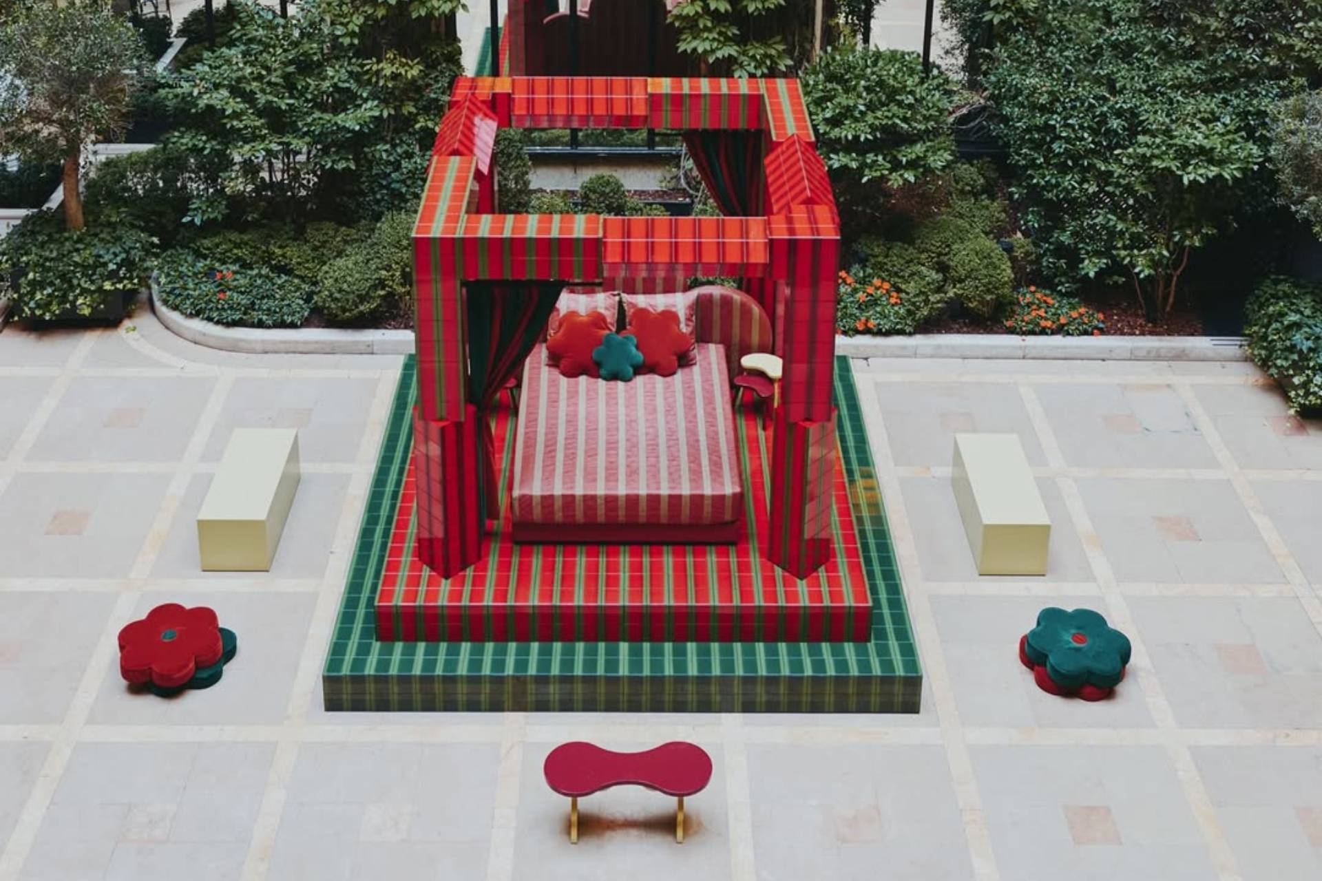 Francuski studio Uchronia pretvorio je dvorište luksuznog hotela u scenu iz snova pomoću pločica u crveno-zelenim tonovima i nameštaja po meri.
