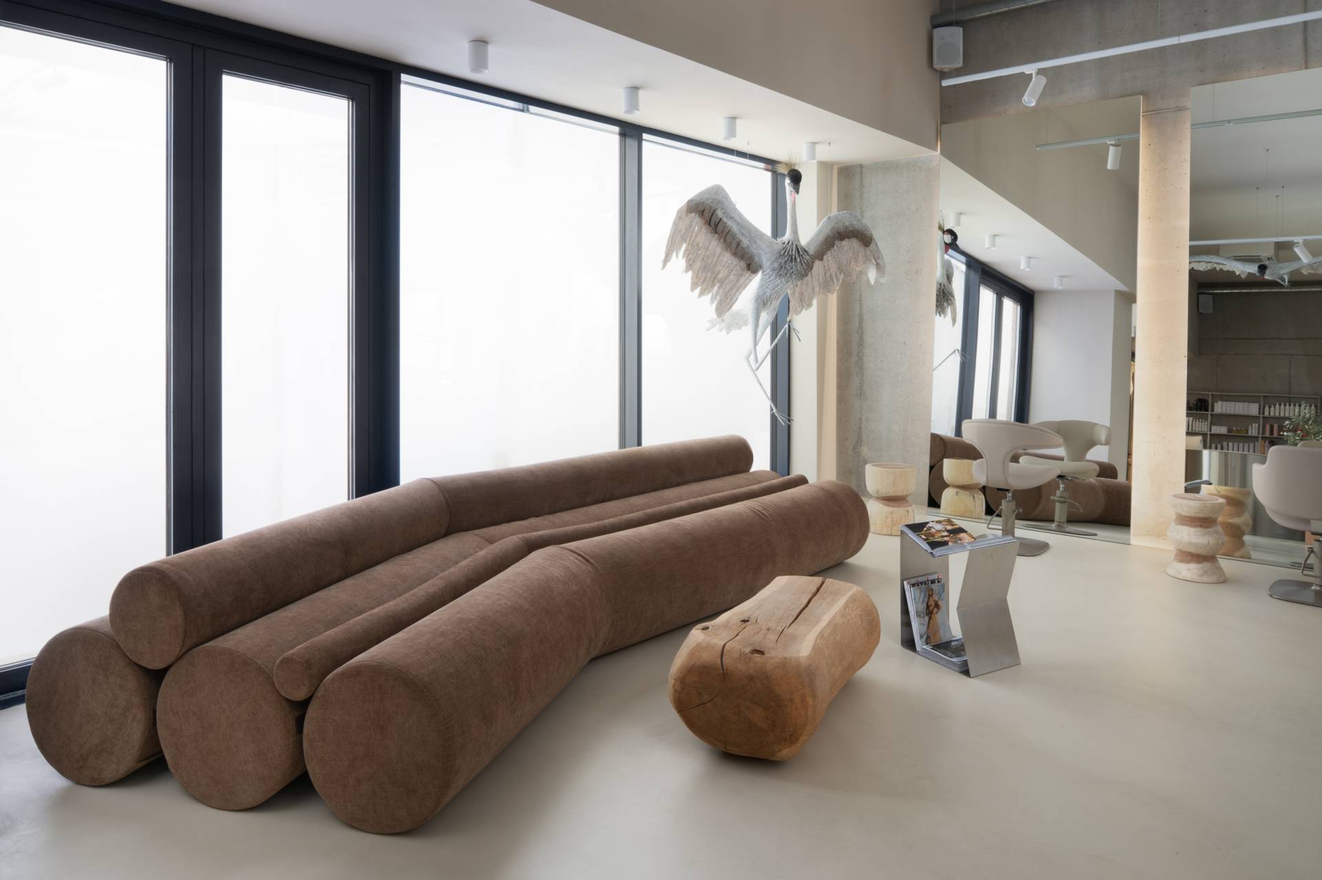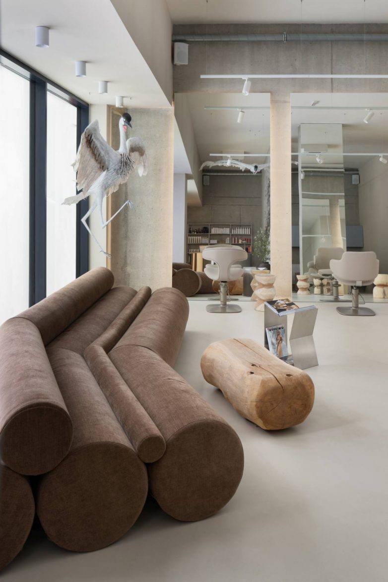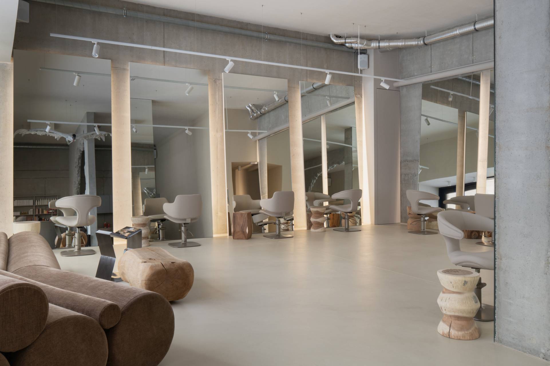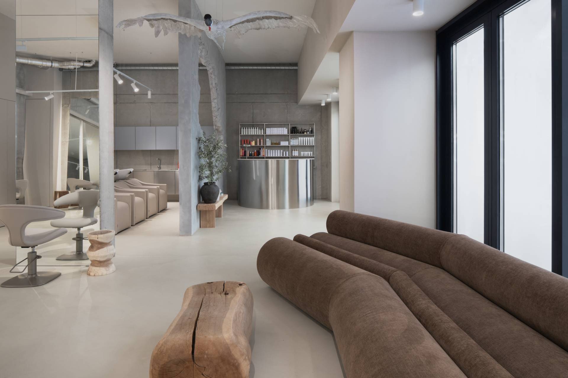 Kristina Bradač Radić je salon preuzela u zahtevnom „roh-bau“ stanju, što je zapravo postalo ključna prednost projekta. „Izrazita visina plafona i sirova tekstura betonskih zidova odmah su definisale karakter enterijera“, objašnjava ona.