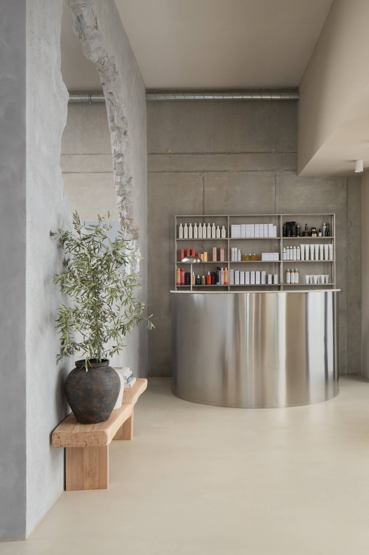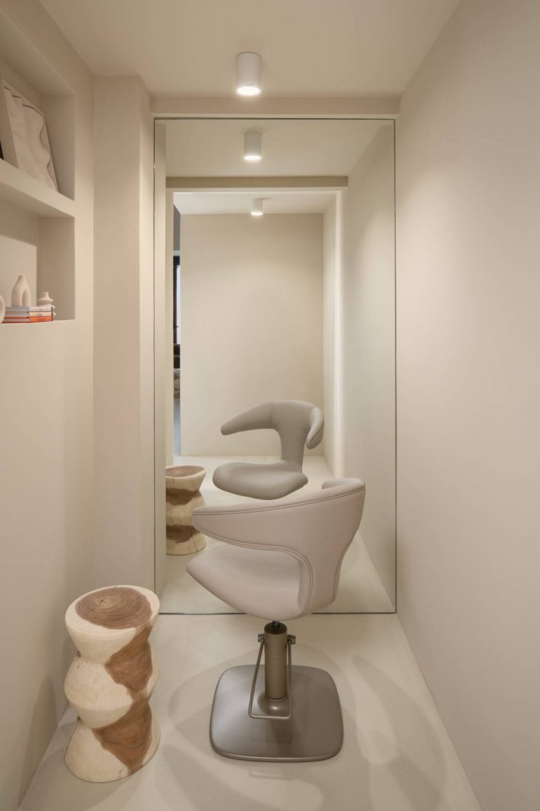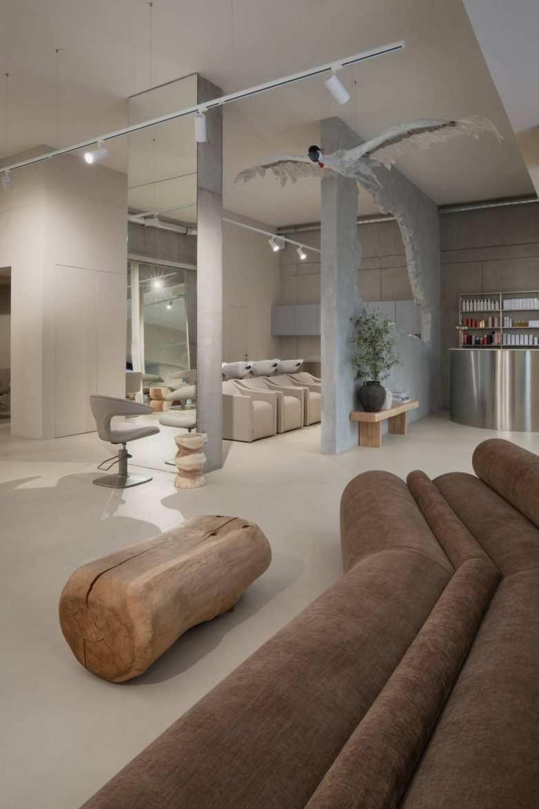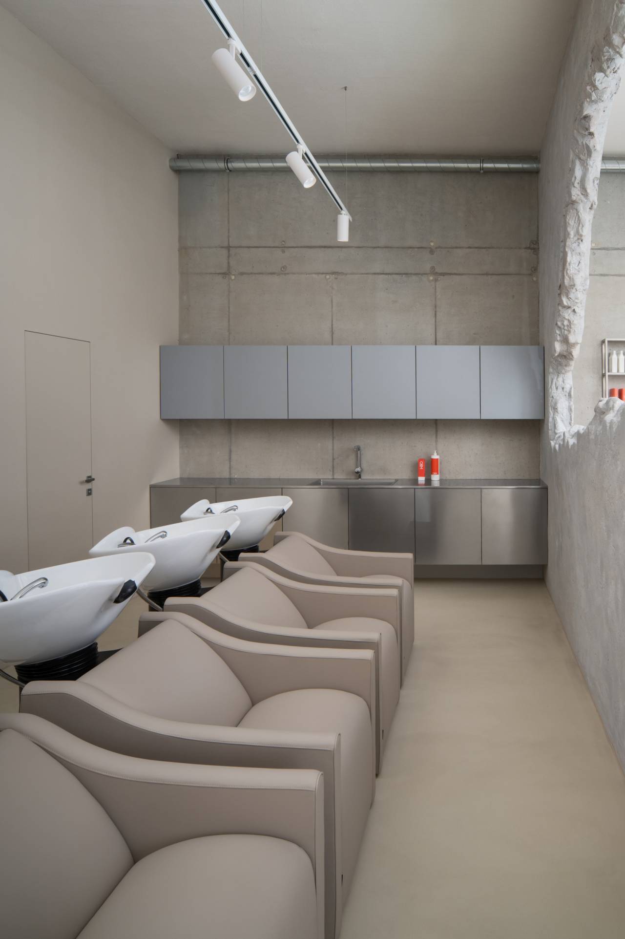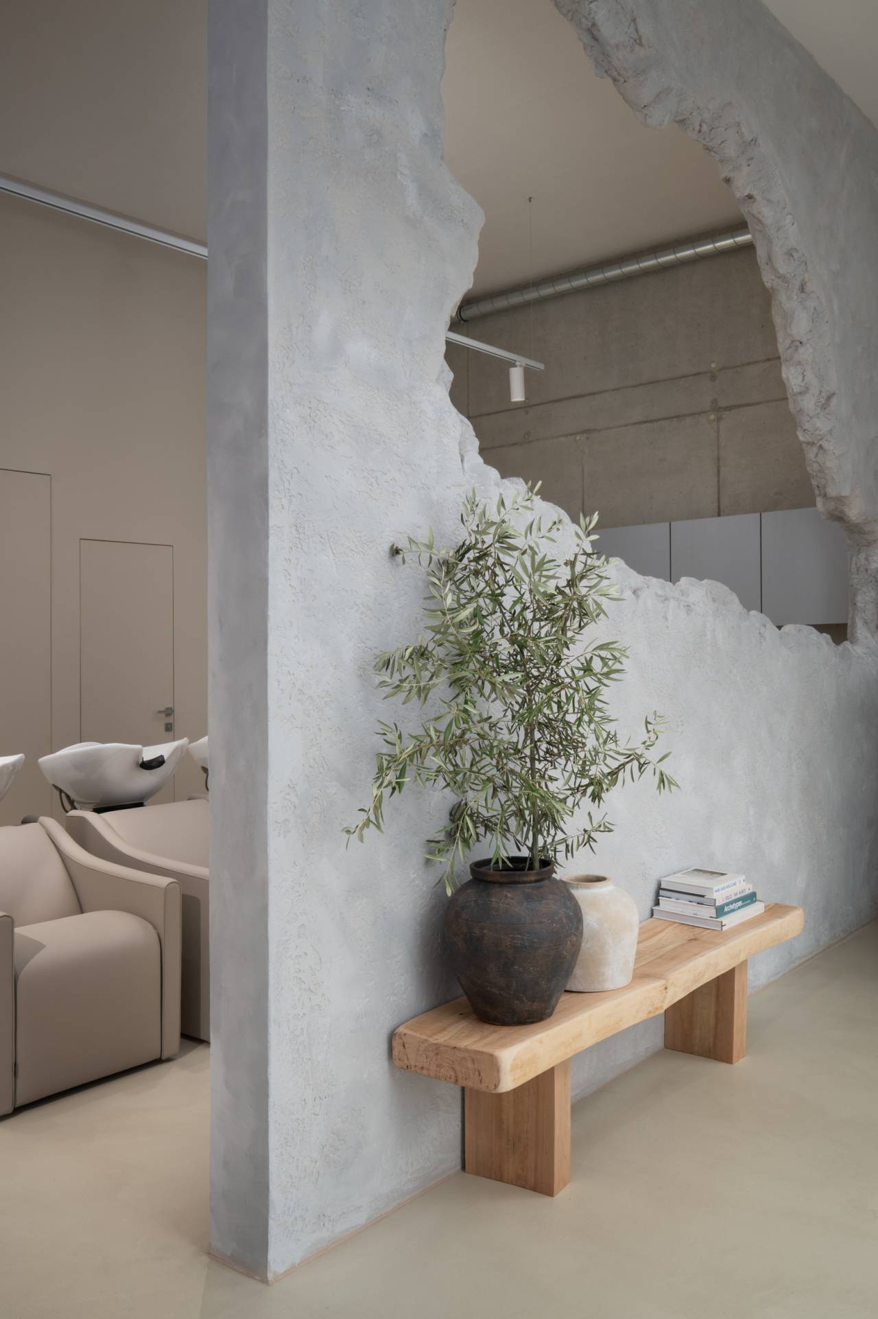 Najprepoznatljiviji element enterijera je skulpturalni zid sa zaobljenim otvorom, koji razdvaja zonu pranja kose i recepcijski deo.