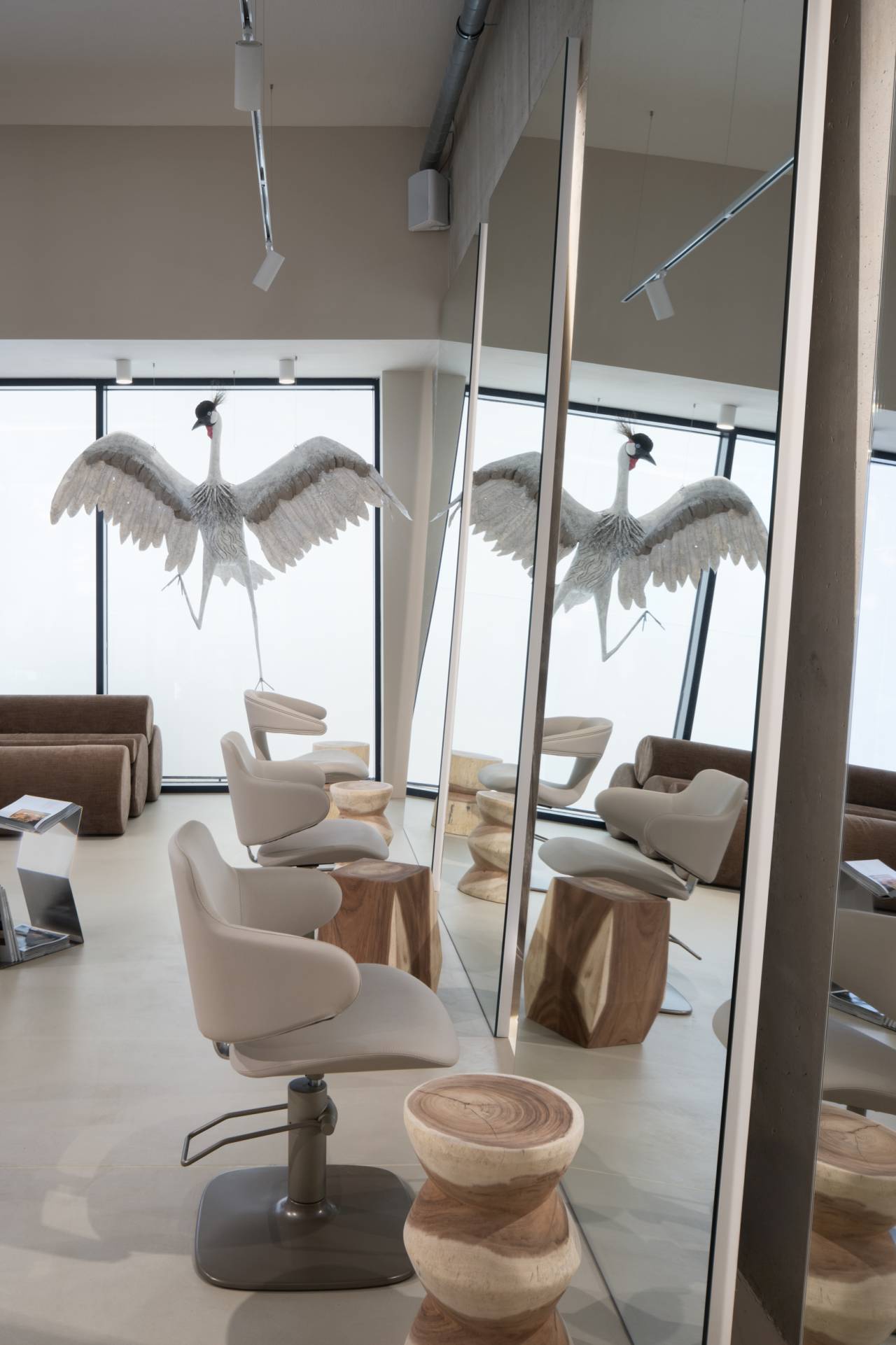Unutrašnjost dodatno upotpunjuju umetnički radovi – ždralovi akademskog umetnika Karla Risa. Oni simbolizuju dugovečnost i transformaciju, vrednosti koje se prirodno naslanjaju na filozofiju salona i daju enterijeru emotivni sloj.