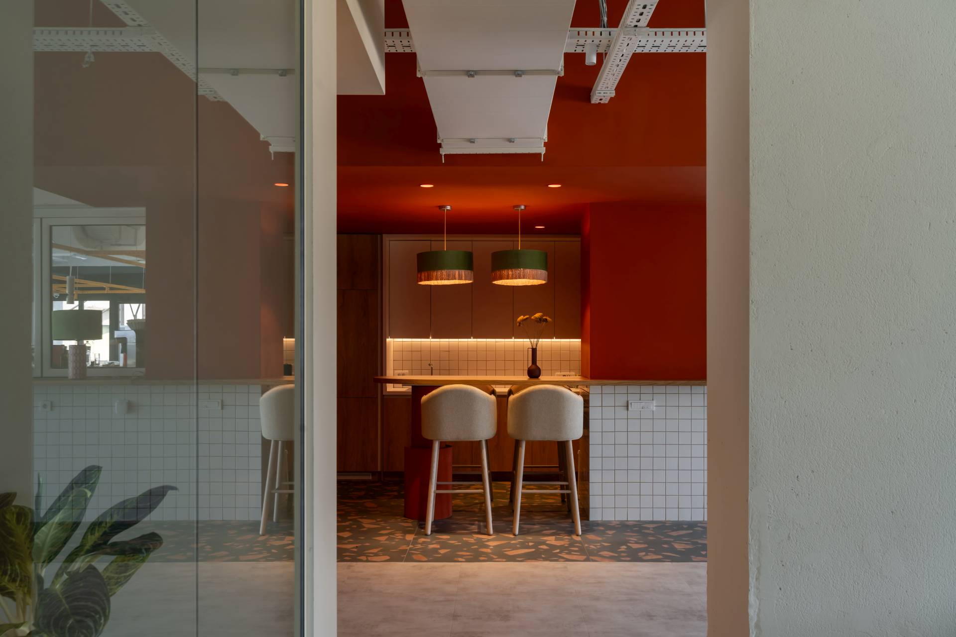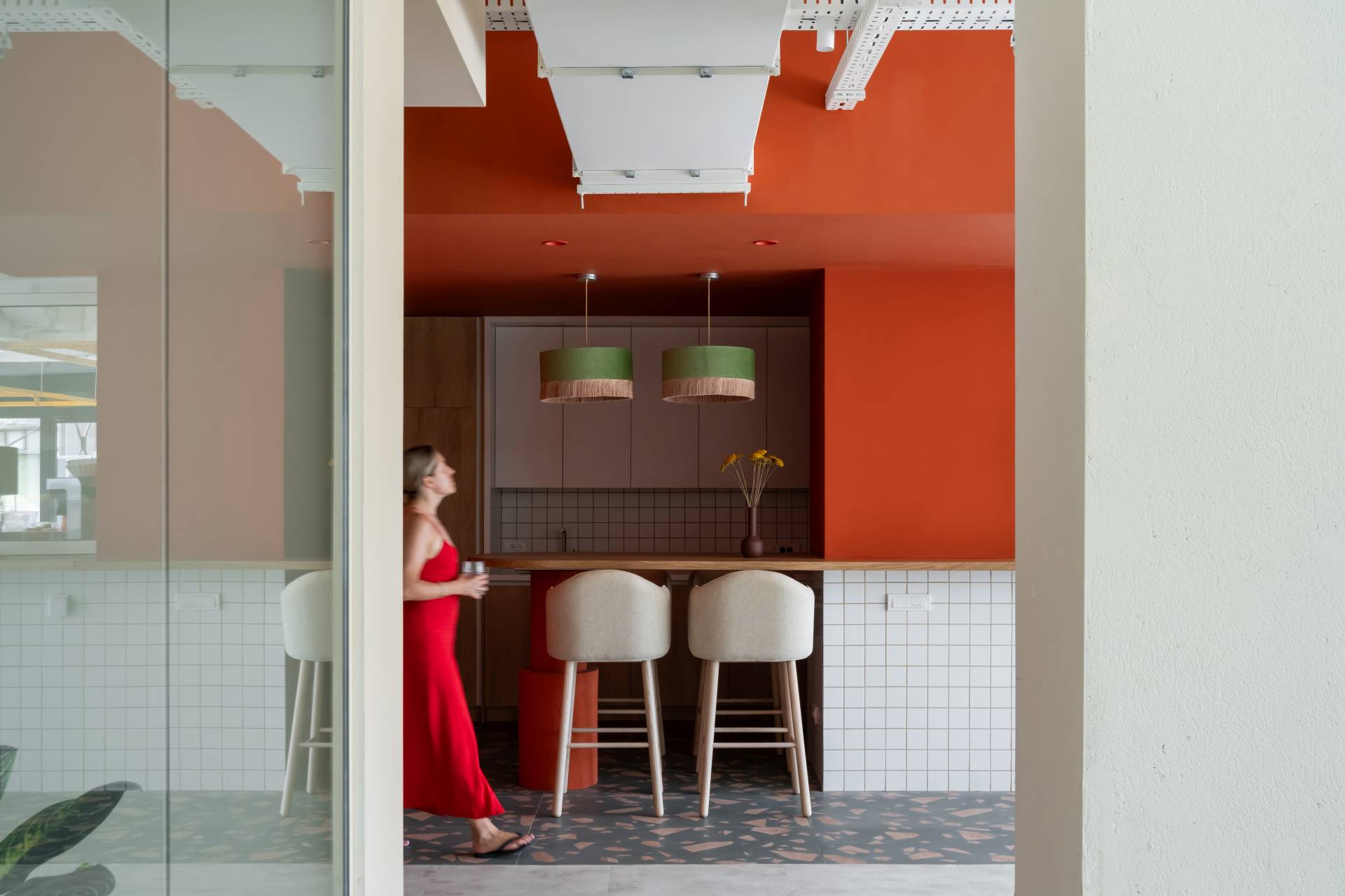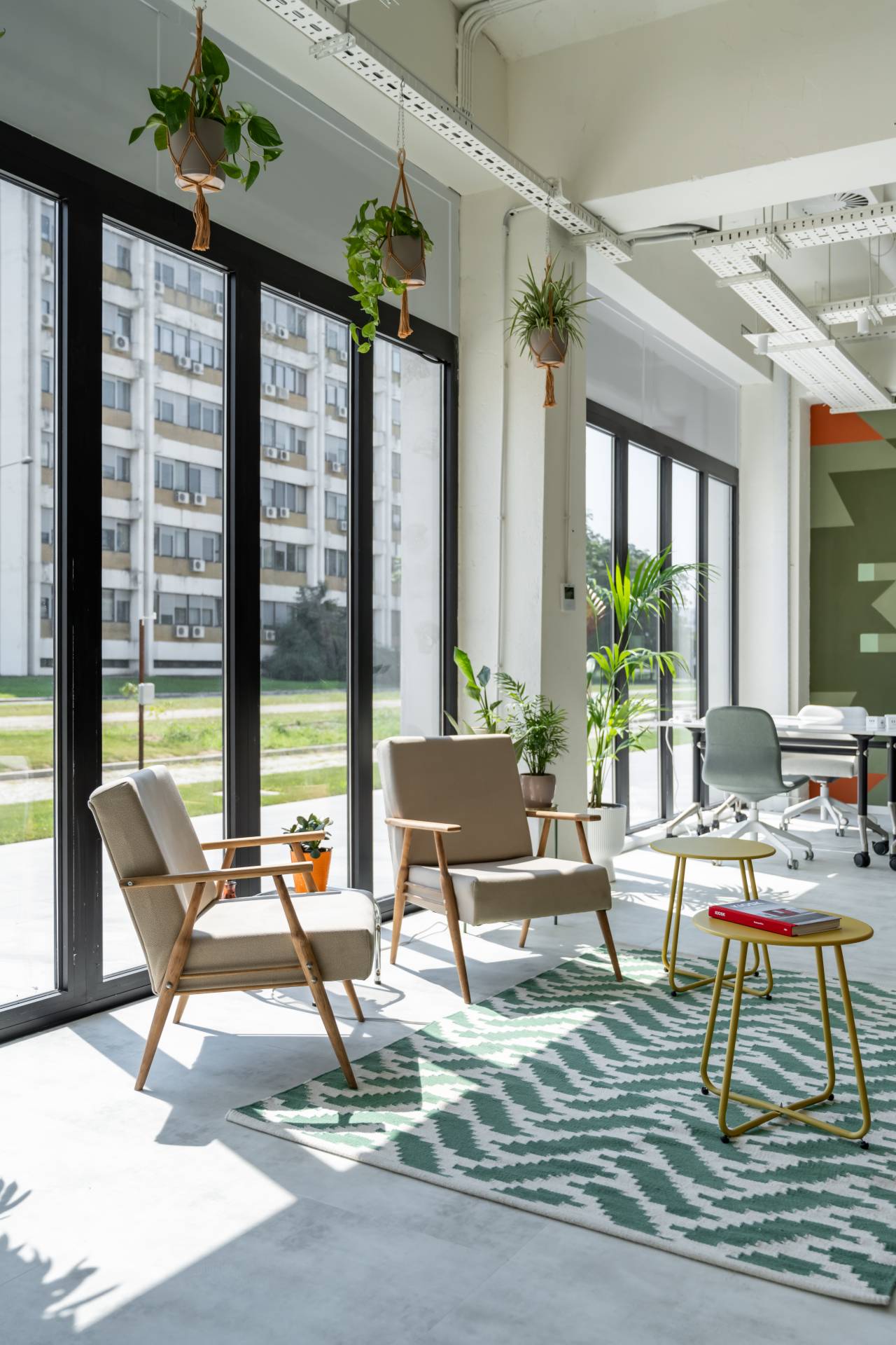 Jarke boje, prirodni materijali i obilje biljaka stvaraju atmosferu između doma i posla. Staklena fasada omogućava pogled na reku i zelenilo, čime se briše granica između spoljašnjosti i unutrašnjosti.