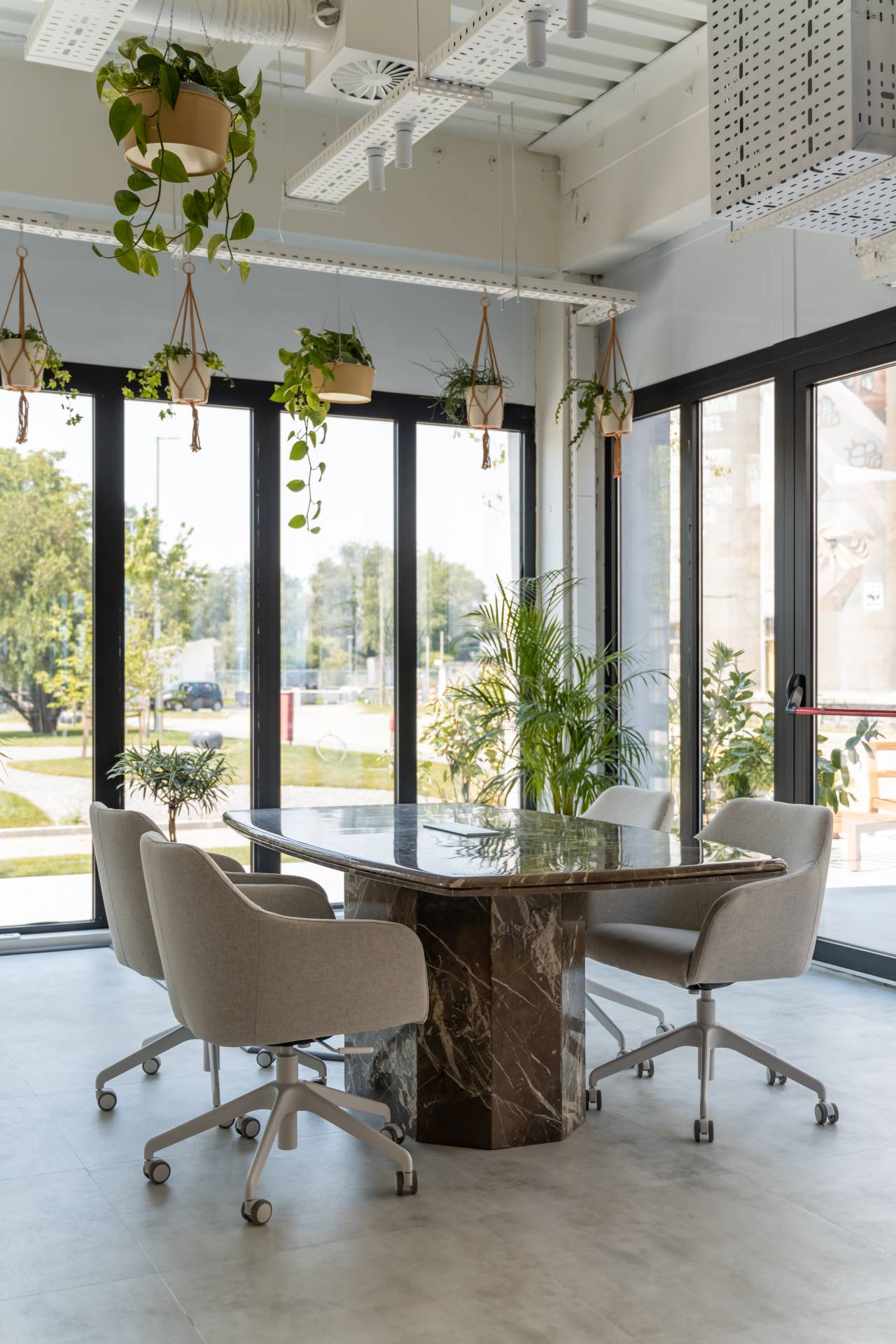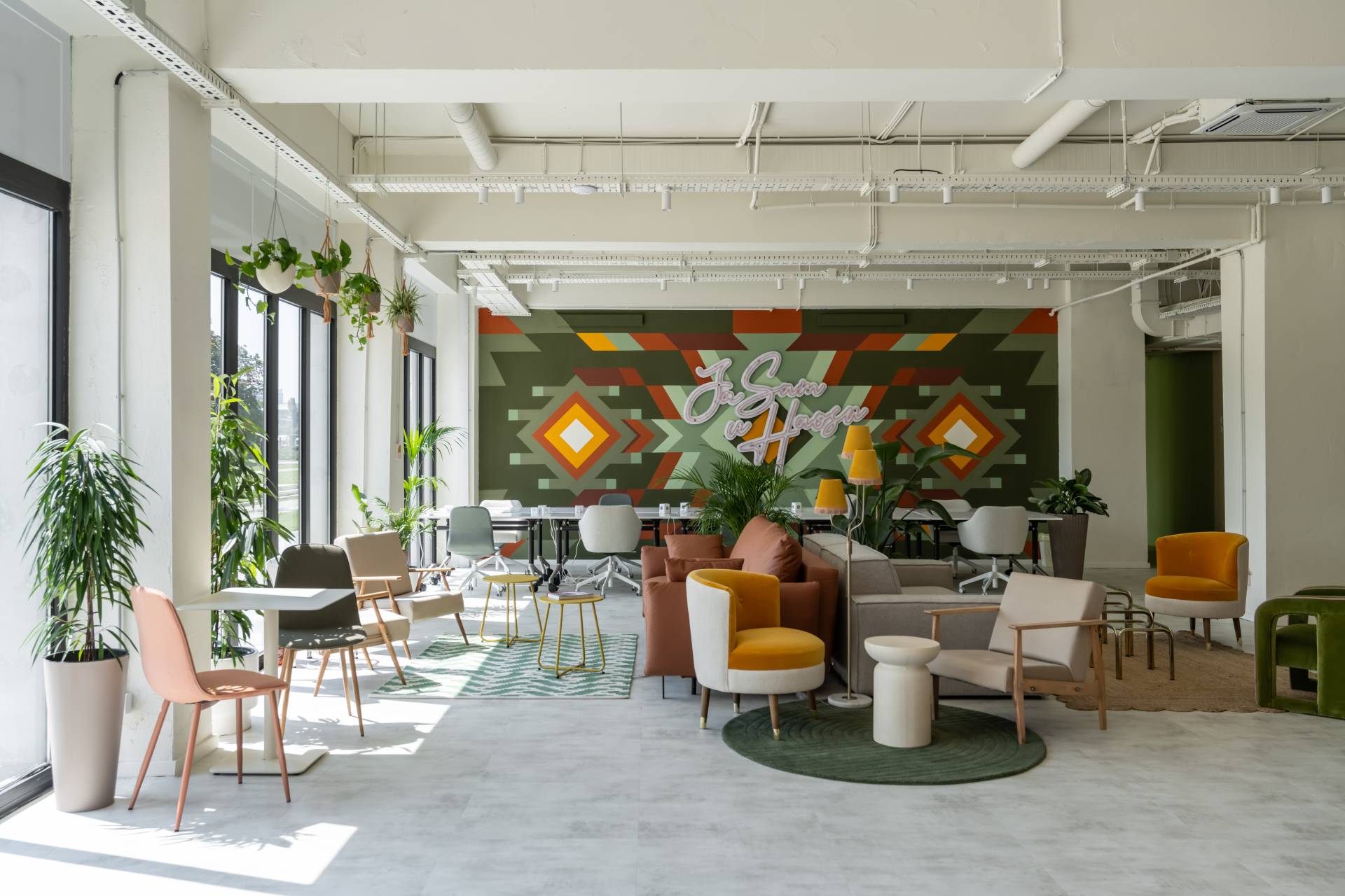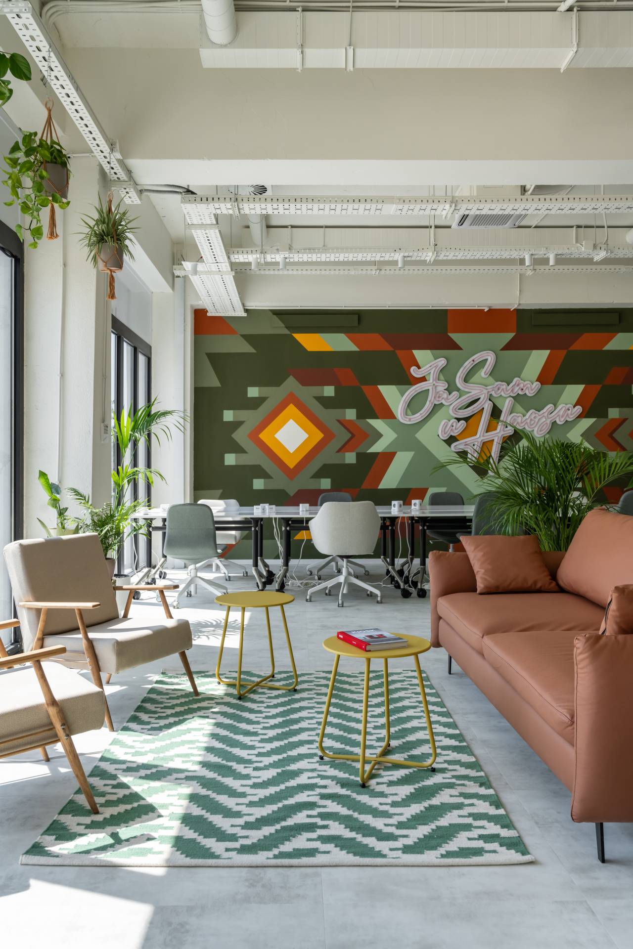 Jarke boje, prirodni materijali i obilje biljaka stvaraju atmosferu između doma i posla.