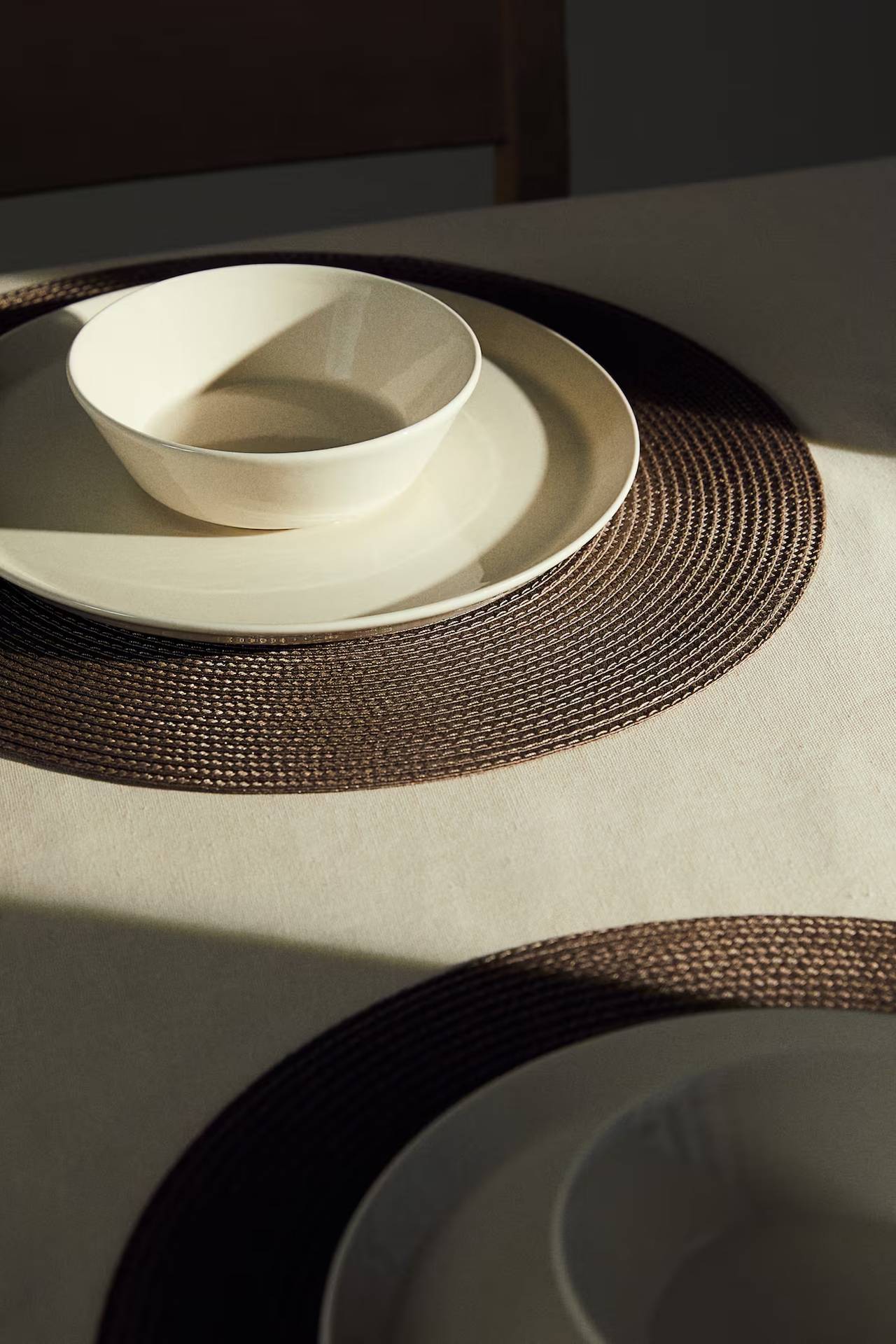 Četiri okrugla podmetača za sto od pletene imitacije slame koji štite stolove od prosipanja tečnosti i oštećenja.