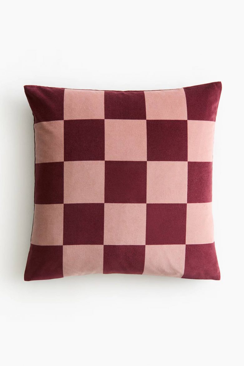 Meka jastučnica od luksuznog somota s kariranim dezenom preko cele prednje strane, jednobojnim naličjem i rajsferšlusom duž jedne ivice. Dostupna u više kombinacija boja.