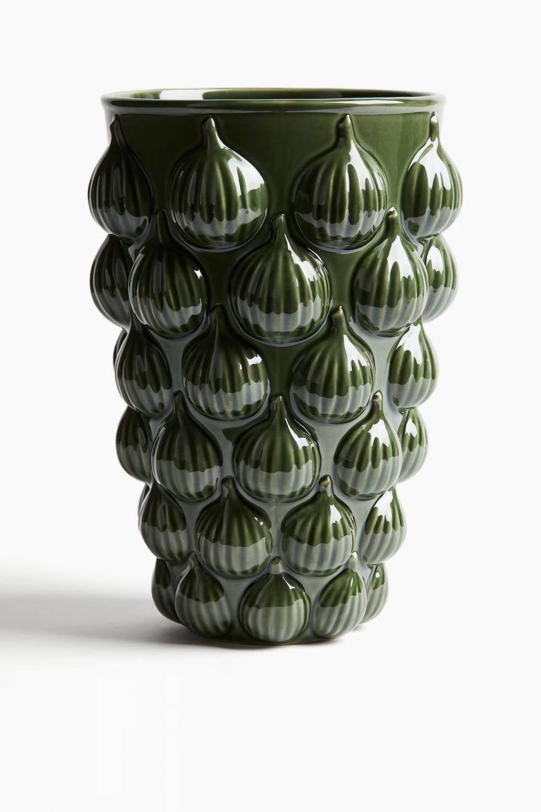 Velika keramička vaza ukrašena reljefnim motivima u obliku smokava, sa sjajnom glazurom. Prečnik postolja 9 cm. Visina 28 cm.