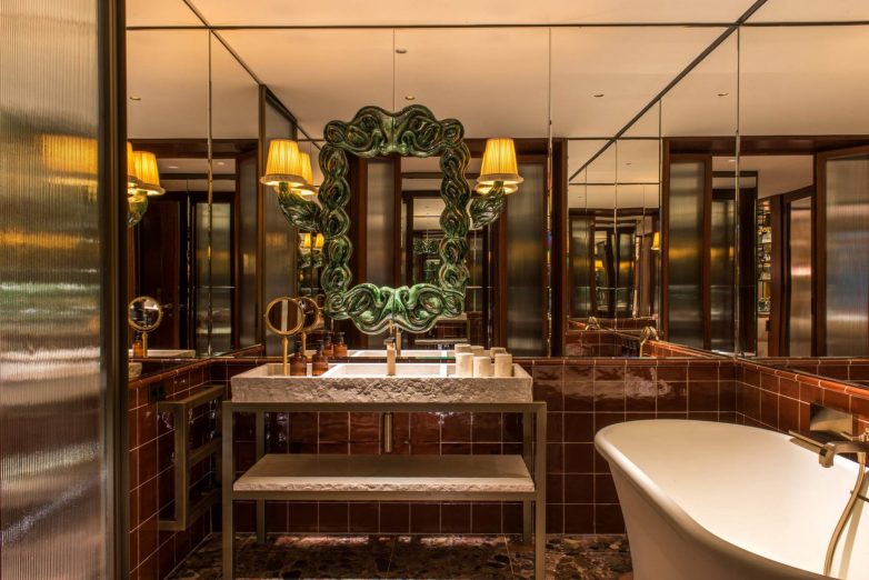 Ulazni lobi prepoznatljiv je po visećim svetiljkama i glaziranim terakota pločicama. Ta ista terakota pojavljuje se i u drugim prostorijama – u sirovom obliku u recepciji, a u zlatnoj, reflektujućoj verziji u podzemnom spa centru.