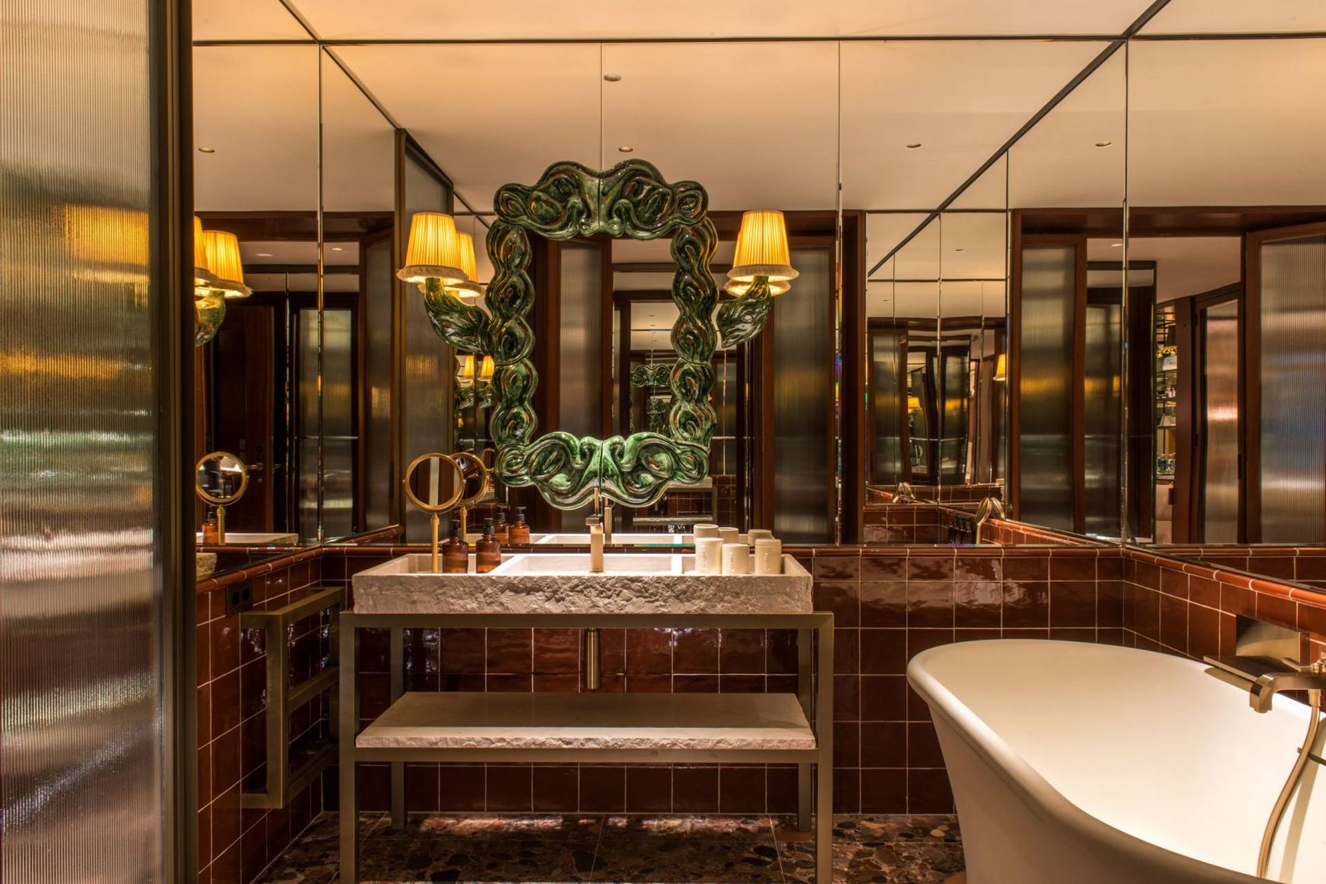 Ulazni lobi prepoznatljiv je po visećim svetiljkama i glaziranim terakota pločicama. Ta ista terakota pojavljuje se i u drugim prostorijama – u sirovom obliku u recepciji, a u zlatnoj, reflektujućoj verziji u podzemnom spa centru.
