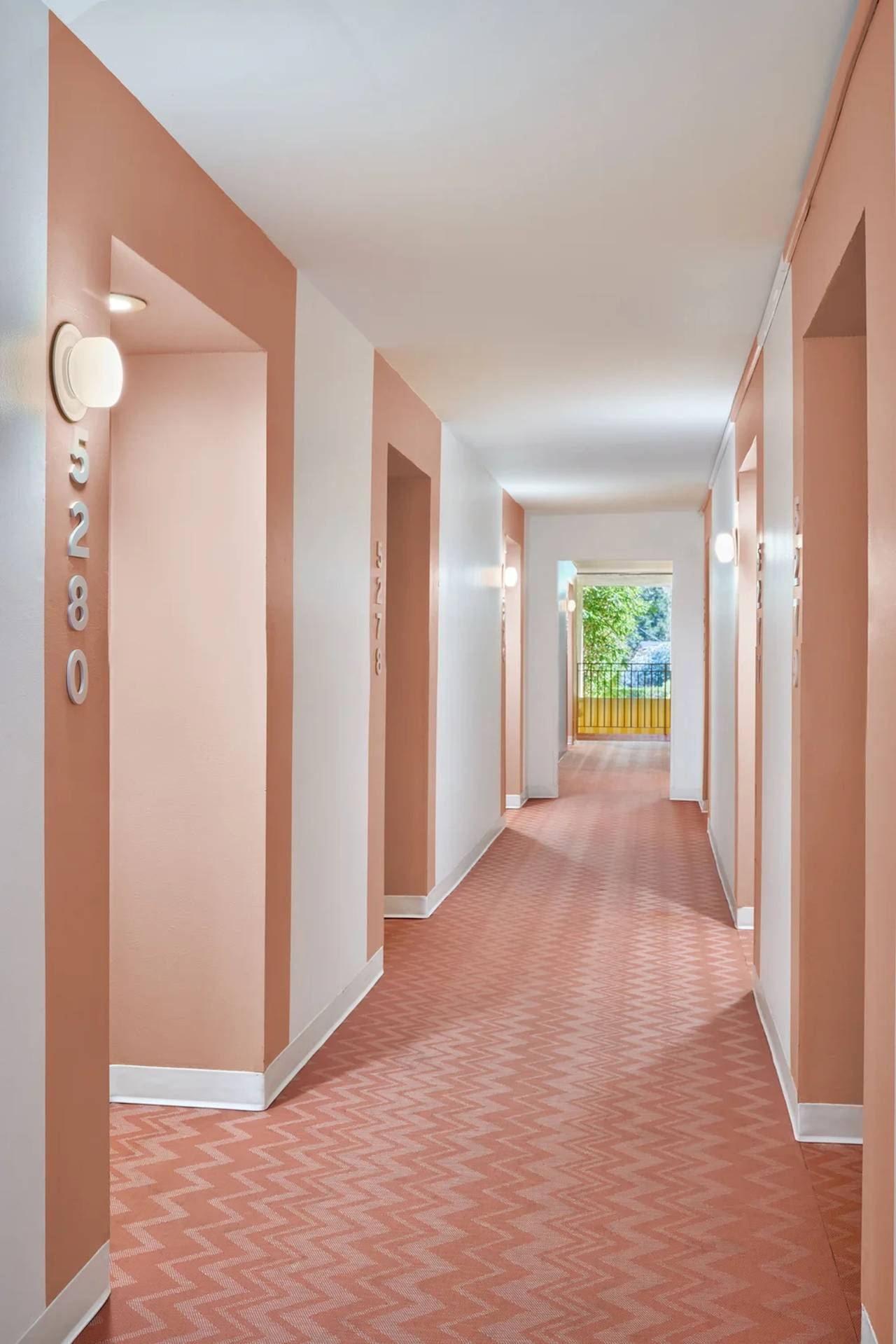 Spratovi koji vode do soba uređeni su u narandžastoj i žutoj boji, uz podne obloge koje dodatno naglašavaju retro duh.