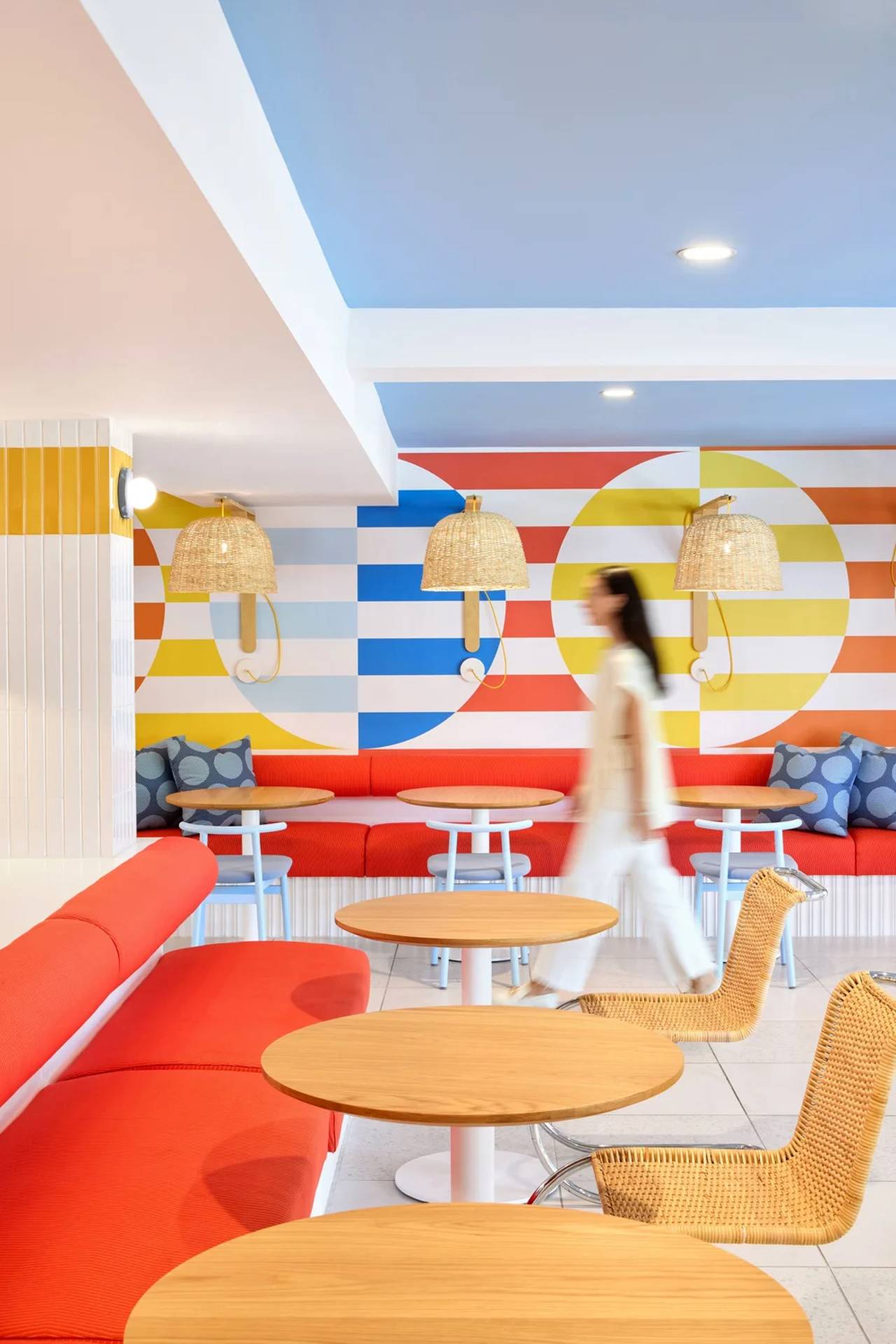 Zidove krase šarene pruge u kombinaciji sa prirodnim materijalima poput ratana, a jastuci sa velikim krugovima unose razigranost. „Tropski motivi provlače se kroz ceo enterijer, naglašavajući sunčani karakter destinacije„, objašnjava tim BHDM-a.