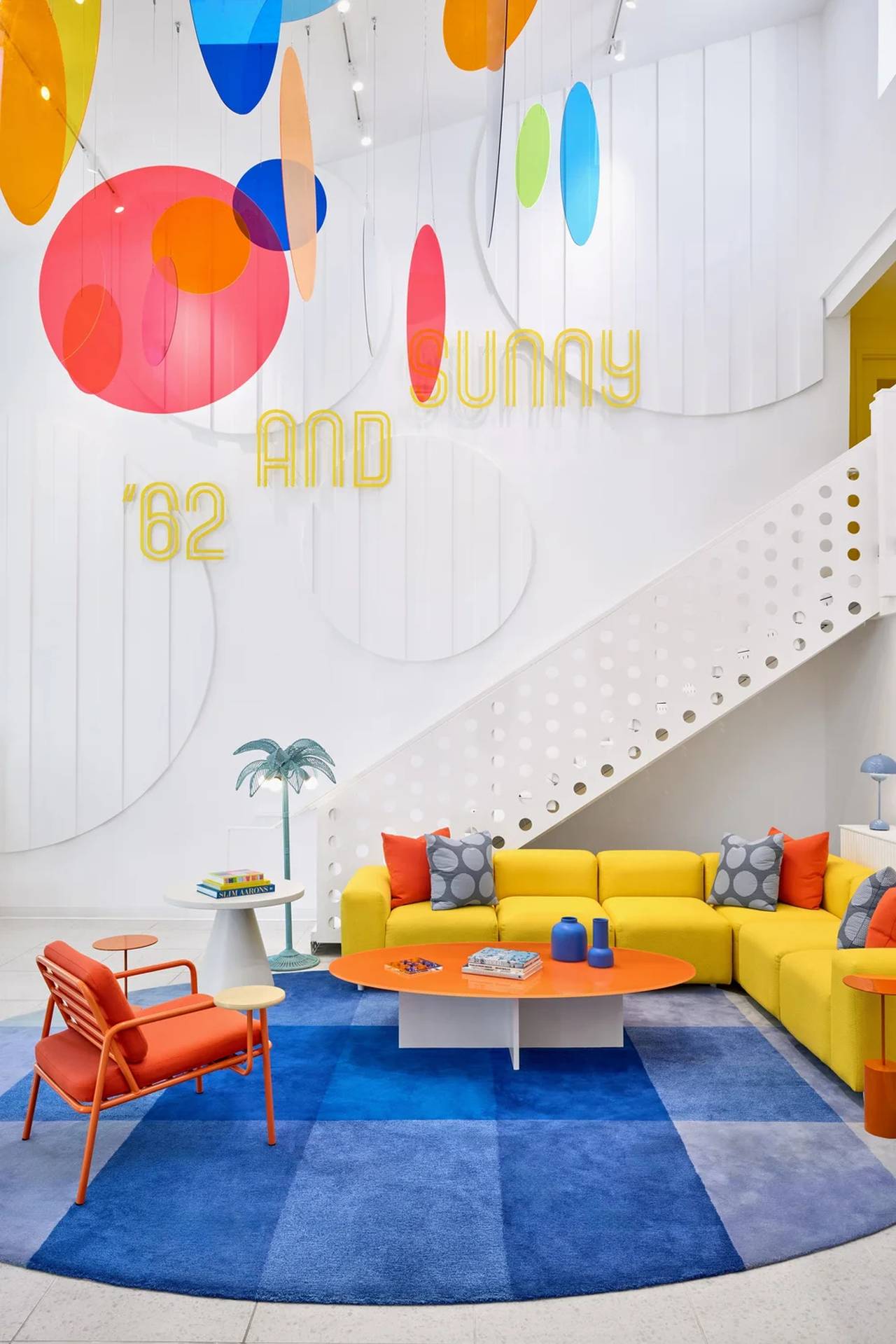 U dvostruko visokom lobiju goste dočekuje instalacija od visećih krugova u jarkim bojama, dok se ispod nalaze sofe u žutoj, stolice u narandžastoj i tepih u nijansama plave. Snažan kontrast nastaje u spoju sa belim zidovima, plafonom i stepenicama.