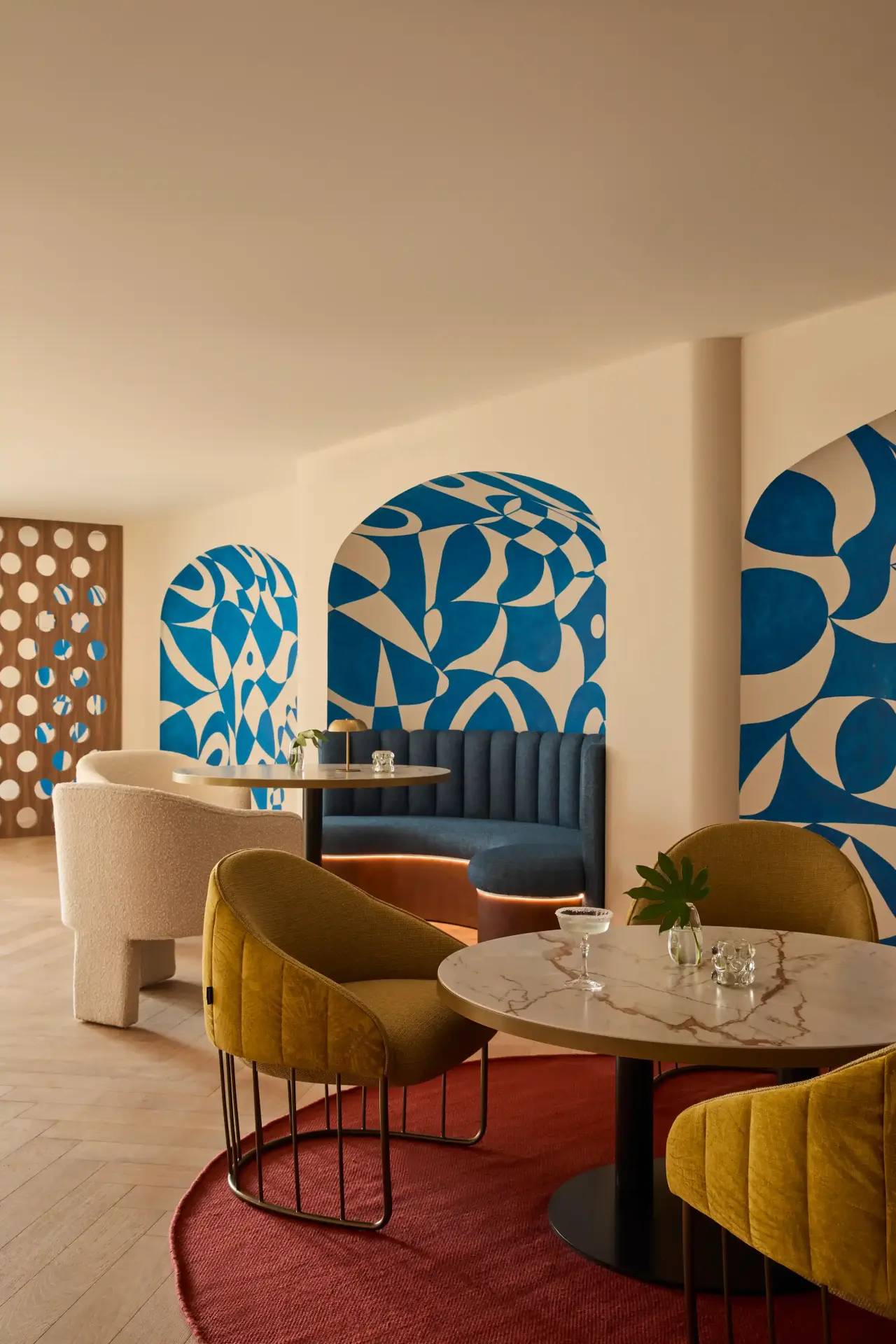 S druge strane, Azul Bar, koji datira još iz 1962. godine, doživljava potpuni redizajn u plavim tonovima, sa 3D keramičkim pločicama i muralima inspirisanim Pikasom. Rezultat je prostor koji se neprimetno transformiše od dnevne relaksacije do večernje sofisticiranosti.