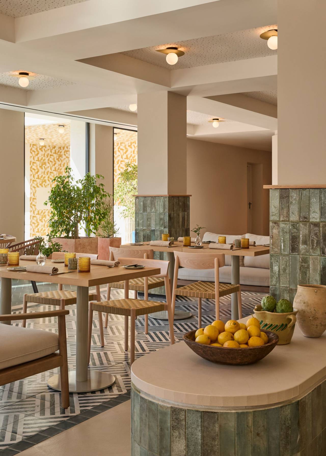 Restoran Jara donosi iskustvo obedovanja u mediteranskom vrtu – bela osnova, pločice u nijansama zelene, puno biljaka i prozračna organizacija prostora stvaraju nepretencioznu, ali elegantnu atmosferu.